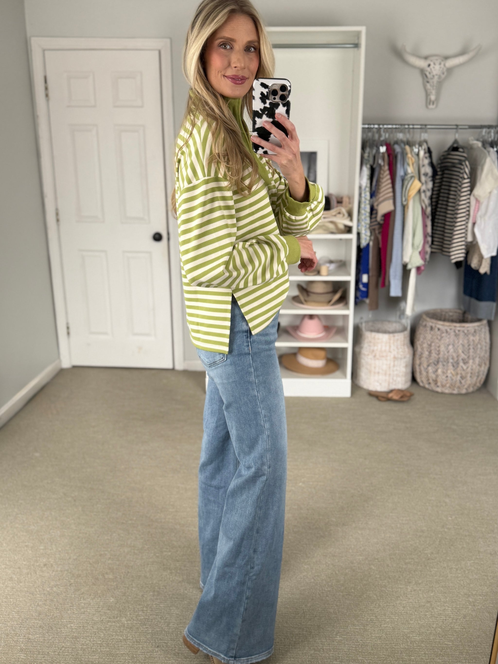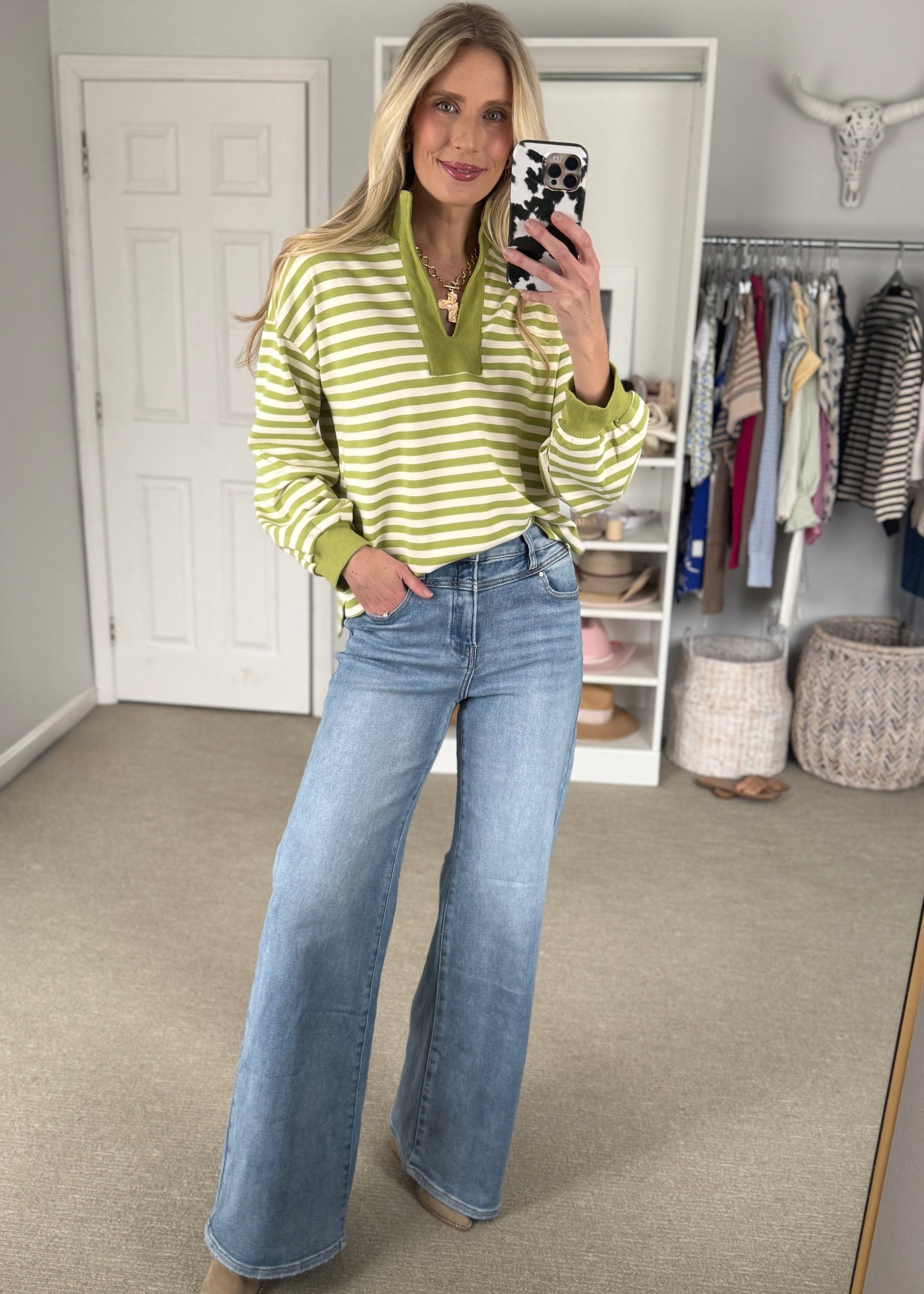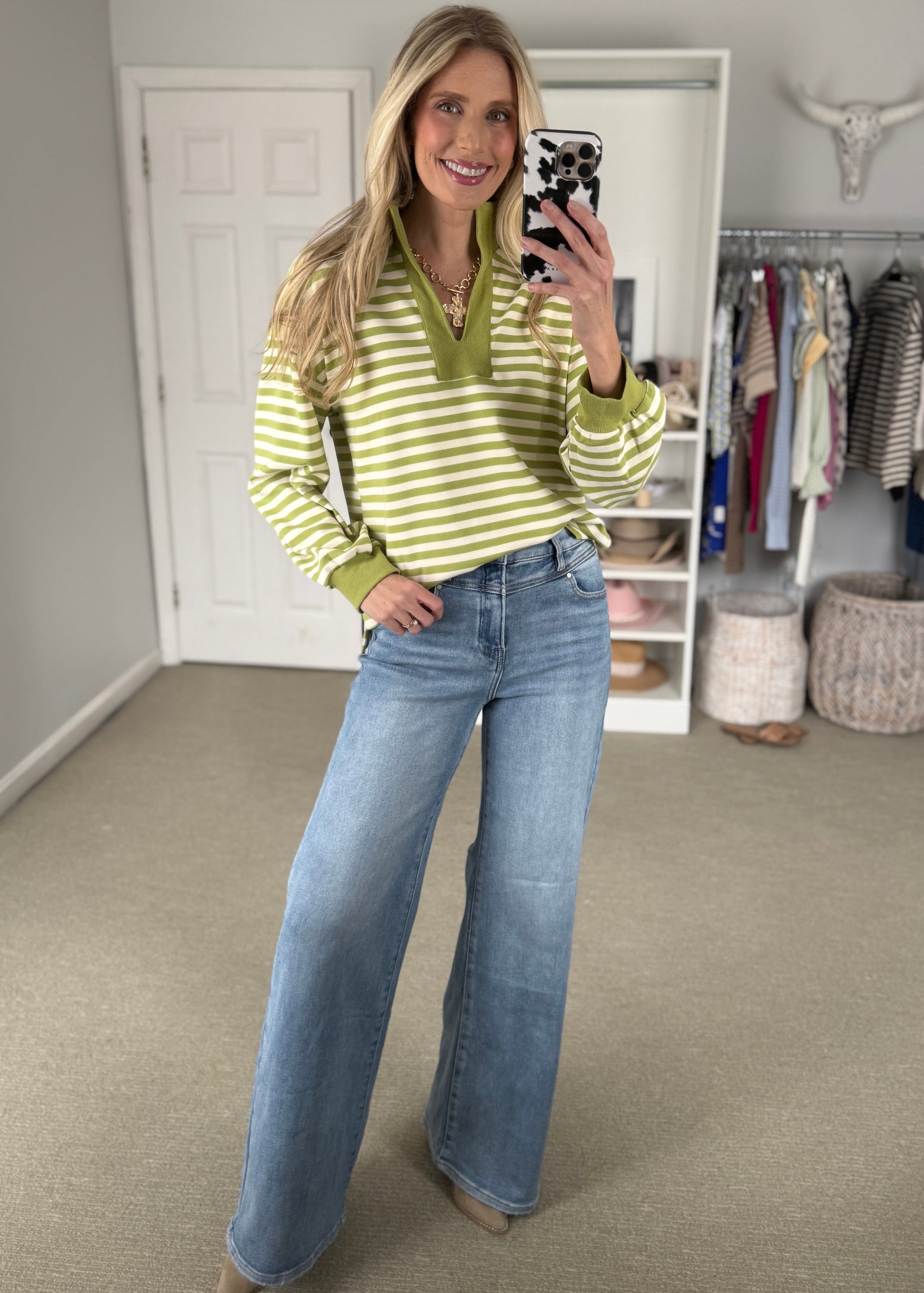Striped long sleeve knit top featuring contrast split V-neck collar and ribbed cuffs. Unlined. Knit. Non-sheer. Lightweight sweatshirt material is unlined. True to size. 50%POLYESTER...