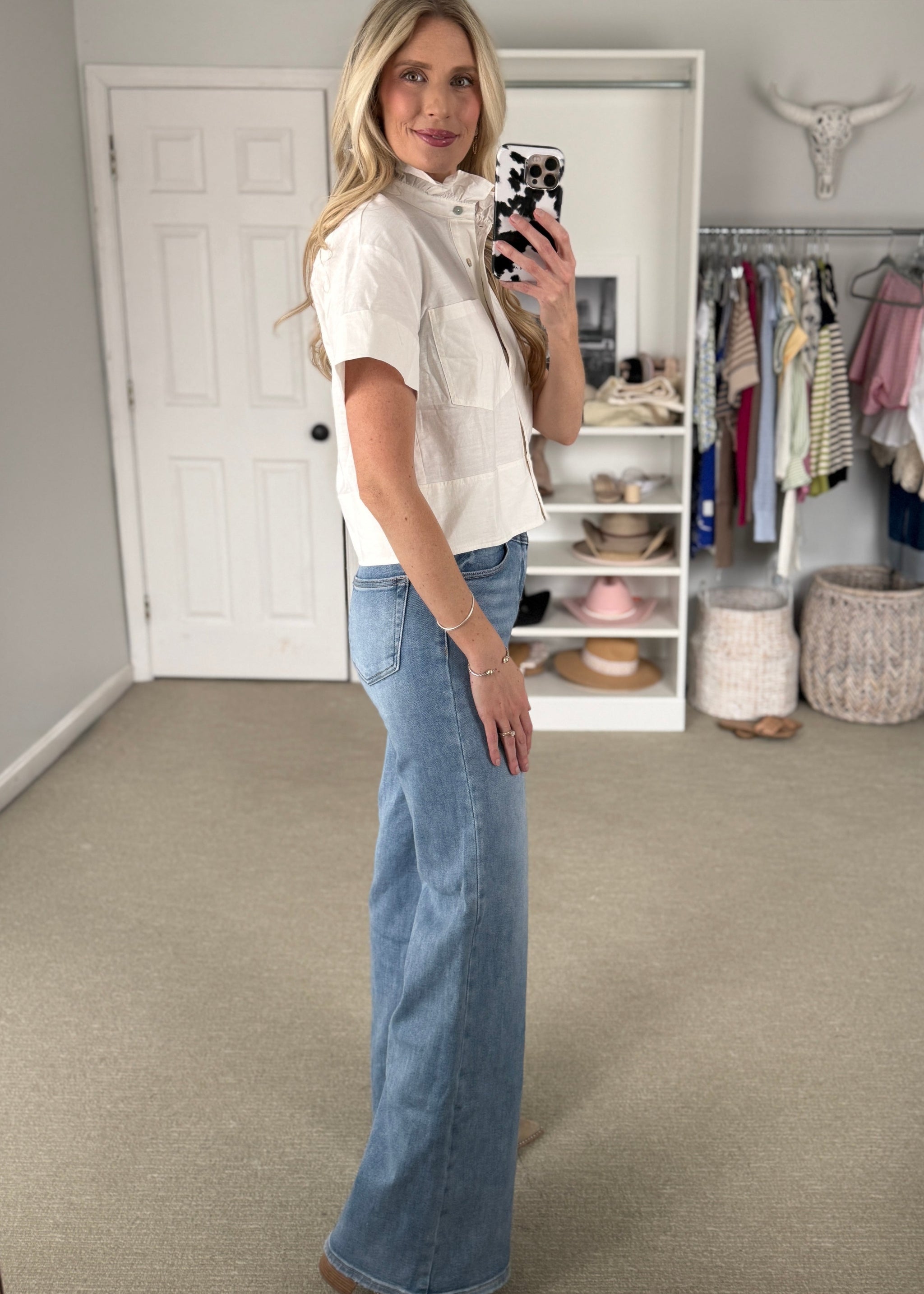 Solid short sleeve top featuring ruffled stand collar and front button closure. Chest pocket. Back pleat detail. Unlined. Woven. Non-sheer. Lightweight. True to size. 70%COTTON...