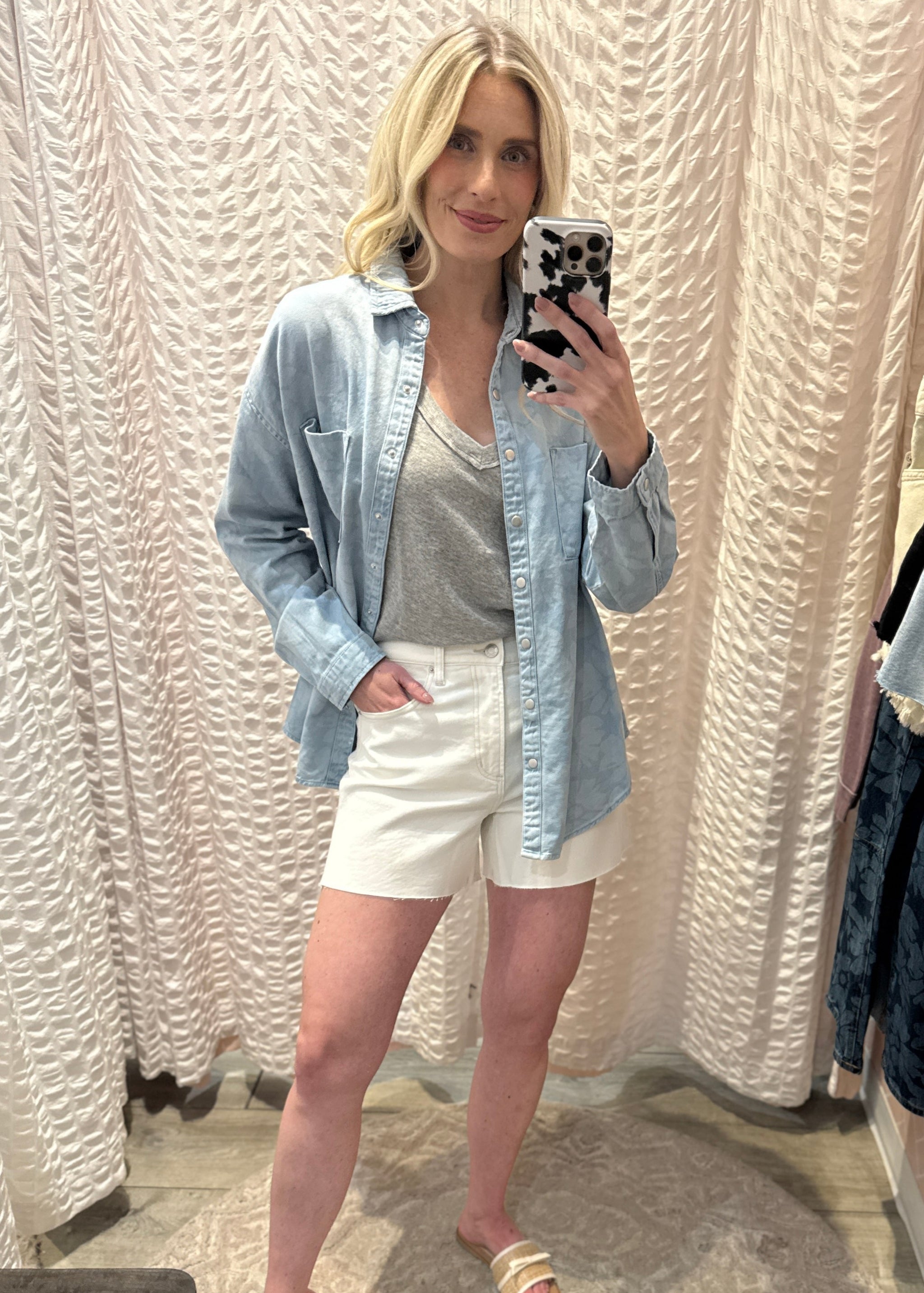 A light blue tone-on-tone floral pattern makes for a very pretty and unique denim shirt. Wear it alone or over a tank for a layered...