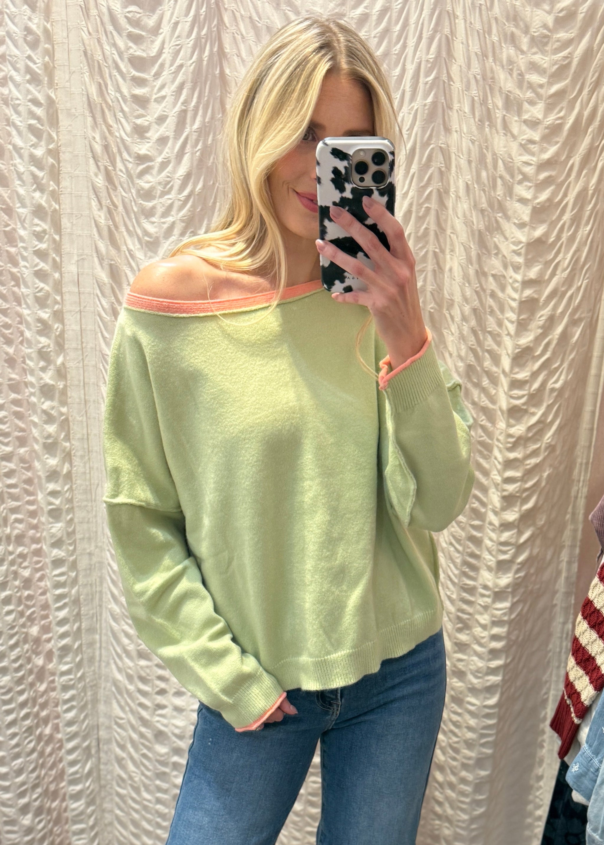 Cozy meets chic with the melon green sweater featuring playful orange trim all around. perfect for adding a subtle pop of style to your everyday...