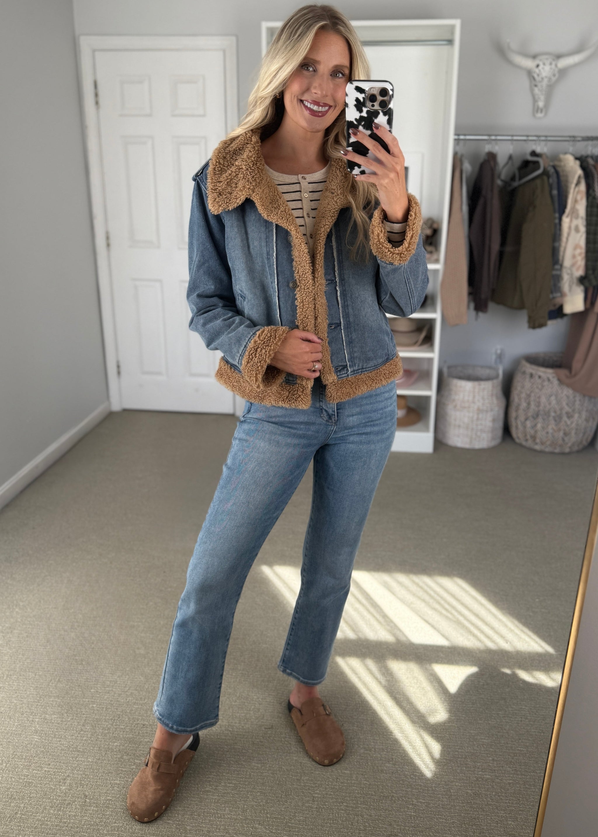 denim jacket with luxurious toffee sherpa lining. True to size.