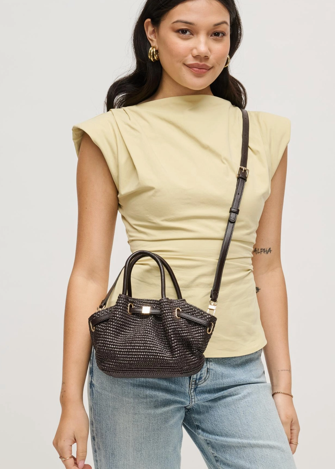 Handwoven bucket silhouette. Textured woven body, adjustable shoulder strap with chic knot and buckle detail, and a stable base