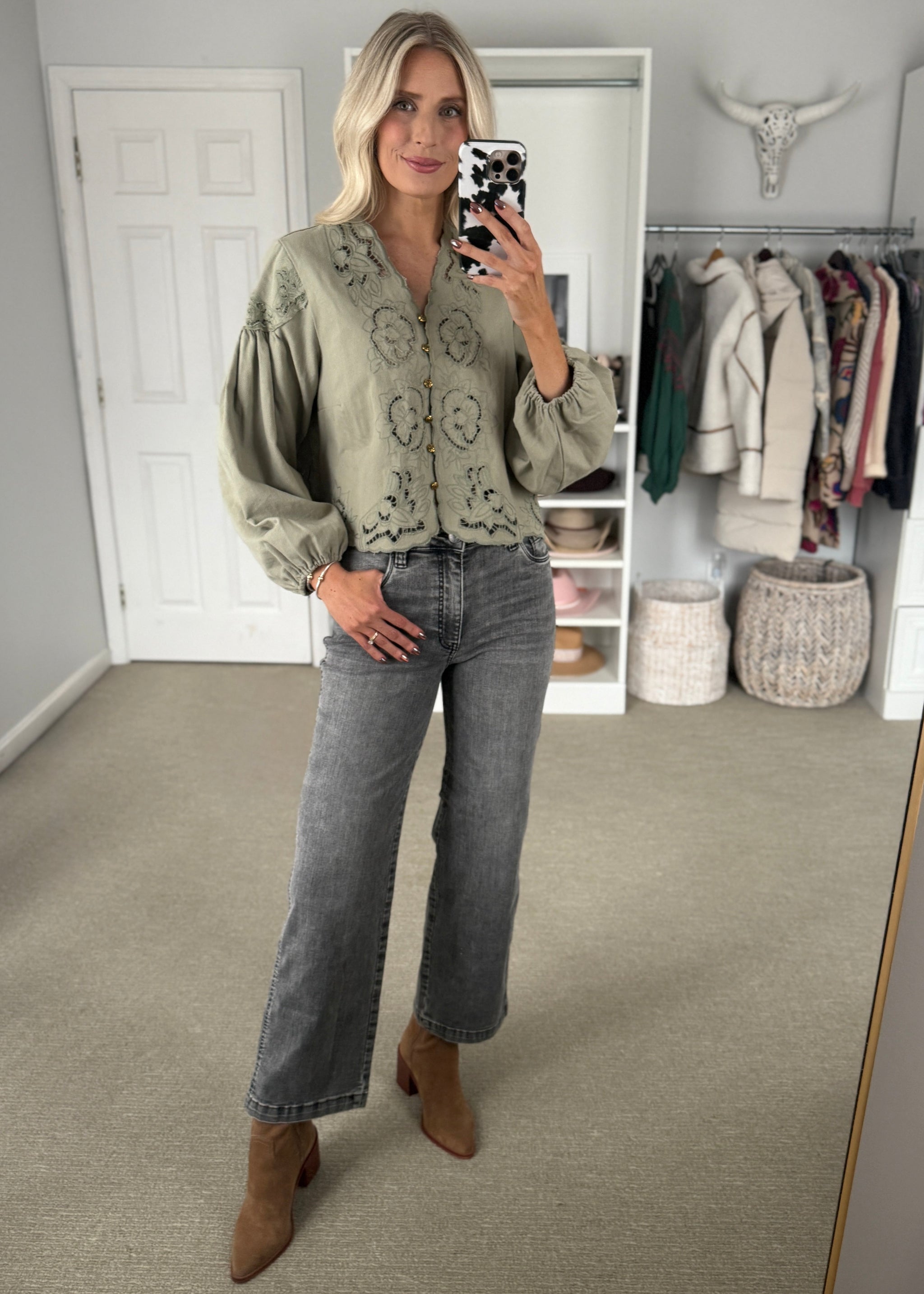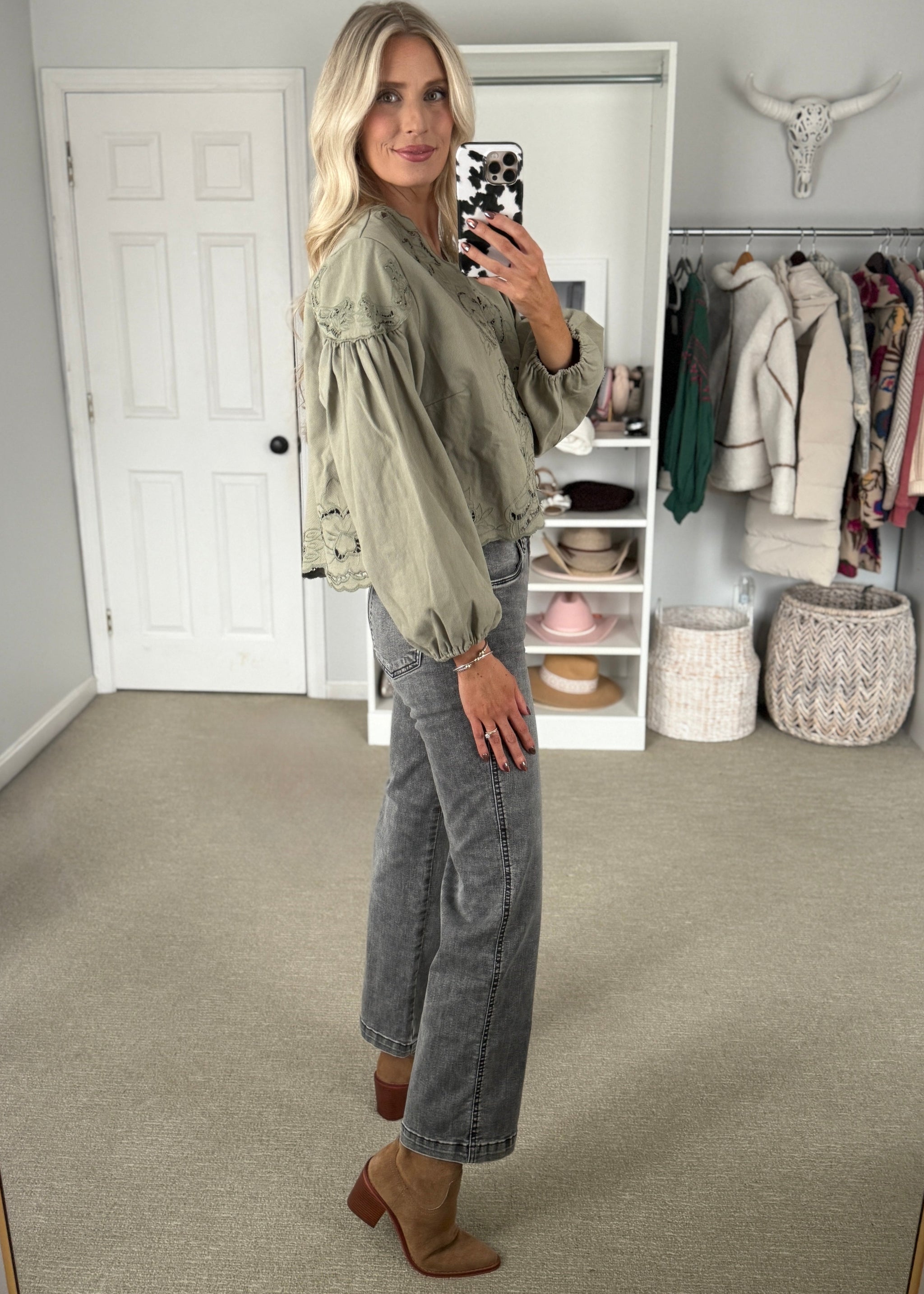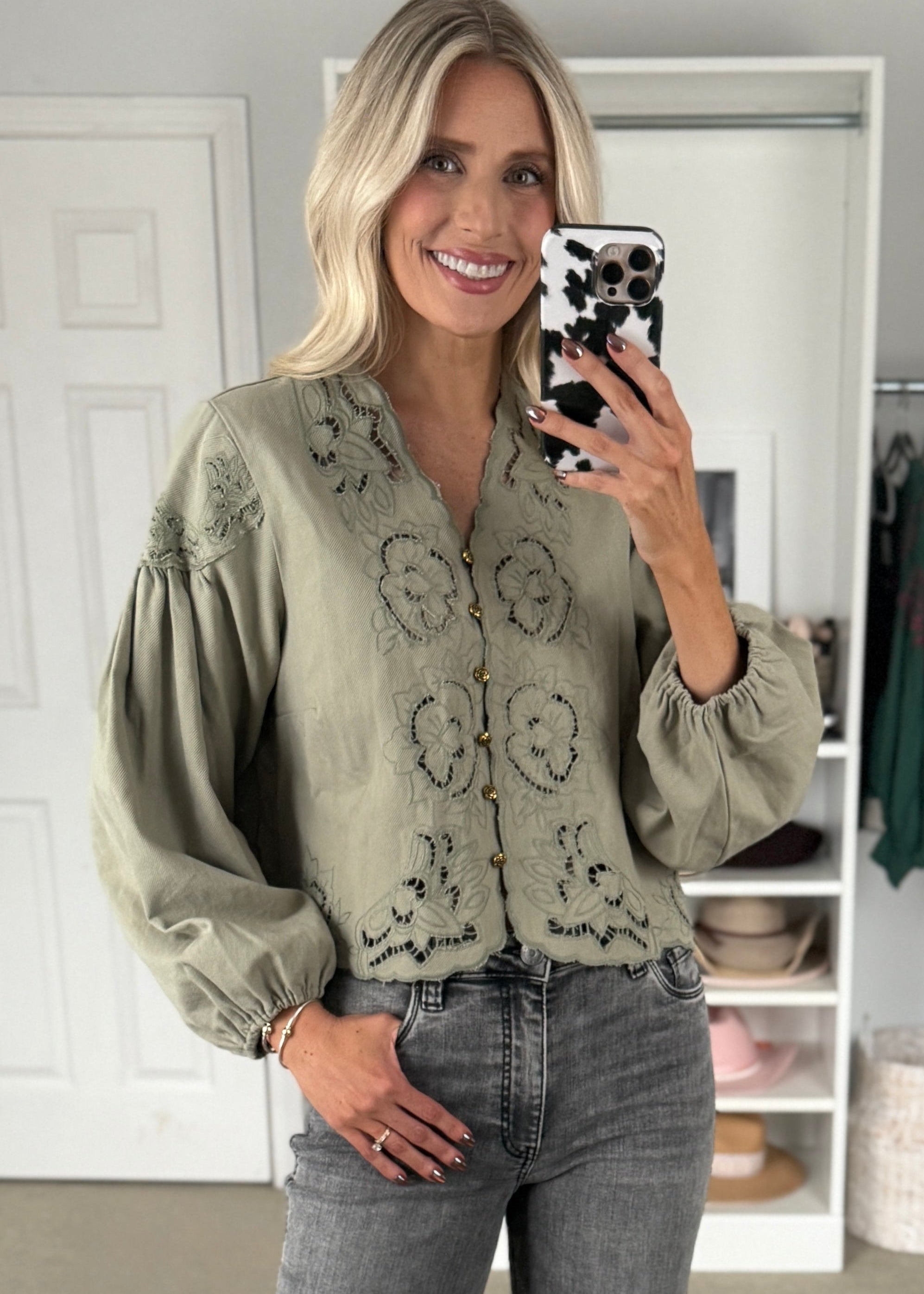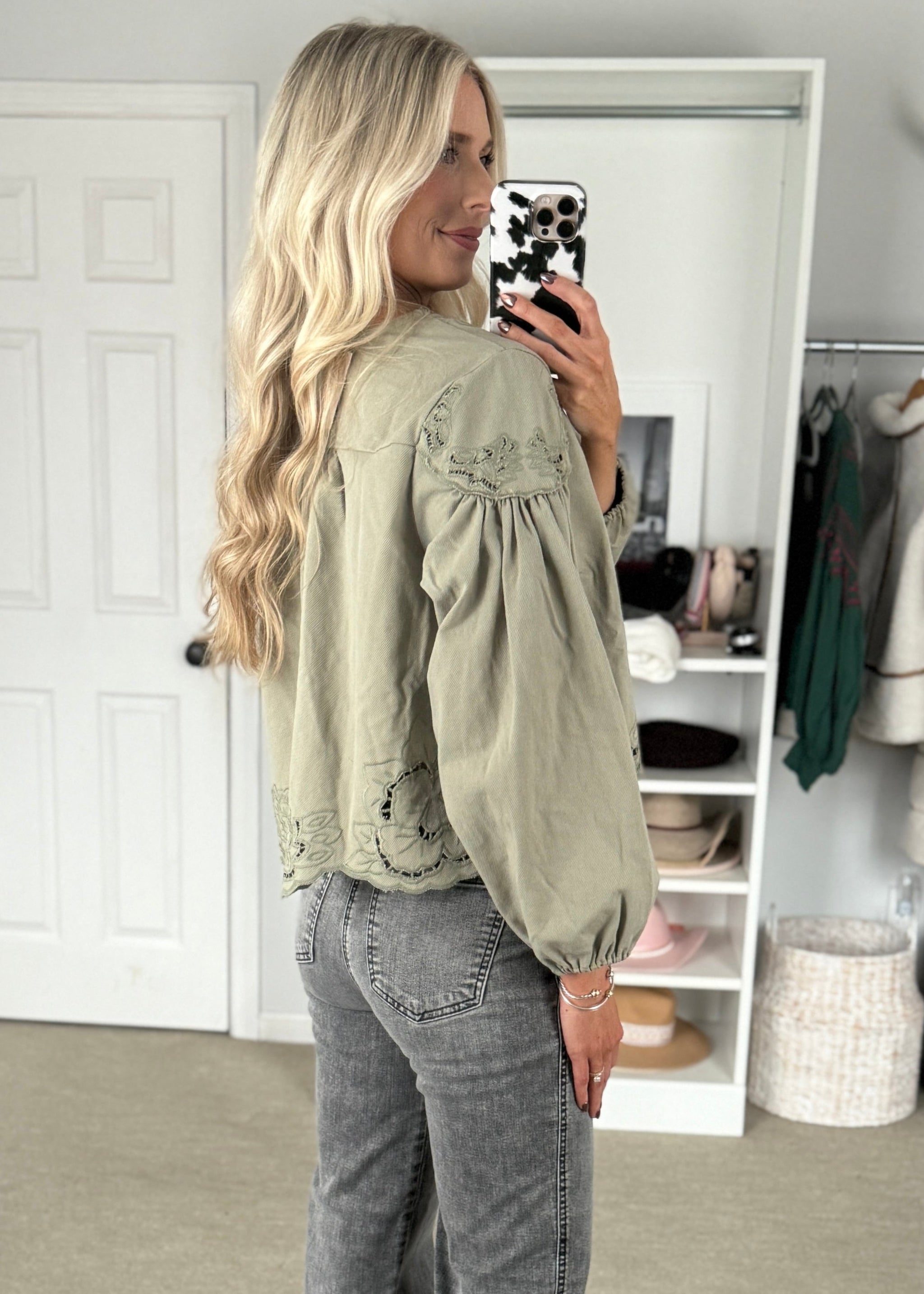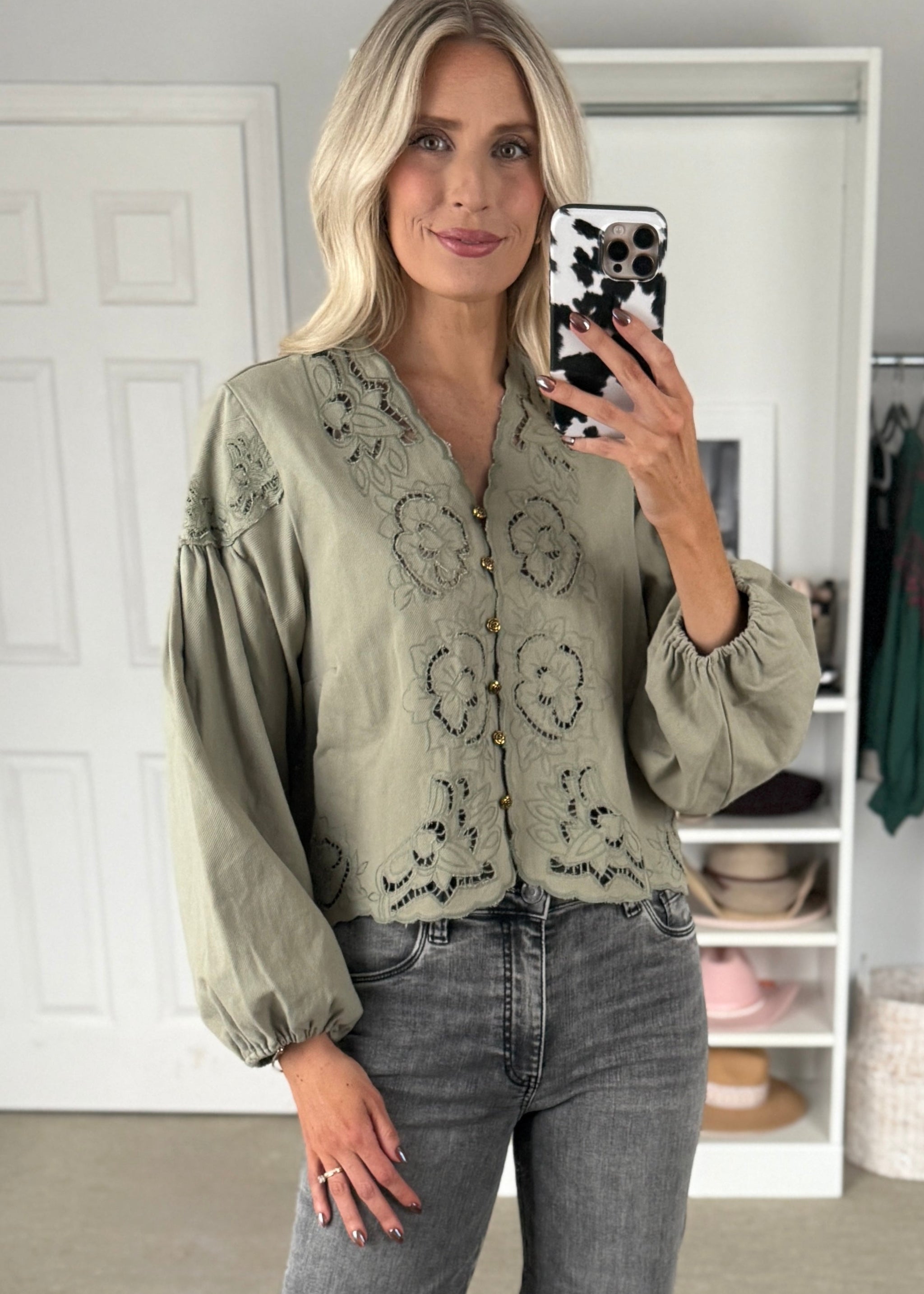 This sage green denim blouse features intricate floral embroidery and delicate cutouts, adding a feminine touch to its relaxed silhouette. The V-neckline and button-down front...
