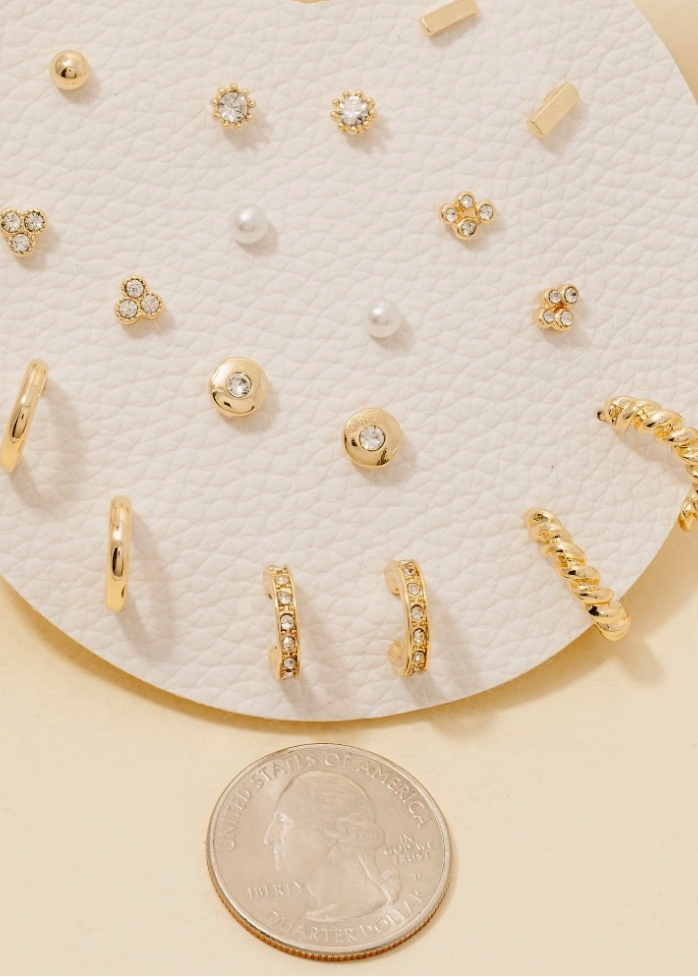 A fun 10 Pair Set of huggie and tiny stud earrings made with 20% Steel 20% faux Pearl 30% Zinc 30% Glass. Gold tone.