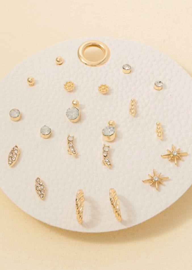 A fun 10 Pair Set of huggie and tiny stud earrings made with 20% Steel 20% crystals 30% Zinc 30% Glass. Gold tone.