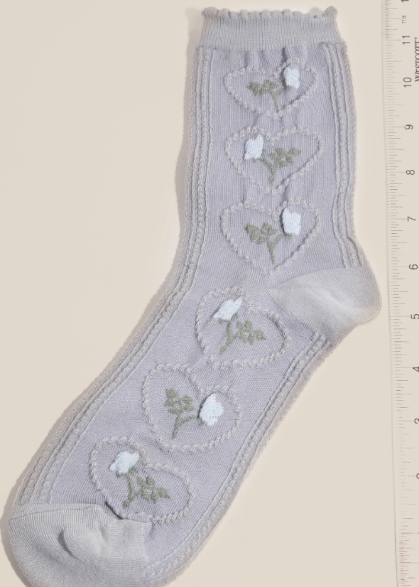 Dusty lavender with textured hearts and dainty blue flowers. Sizing women's 5-10