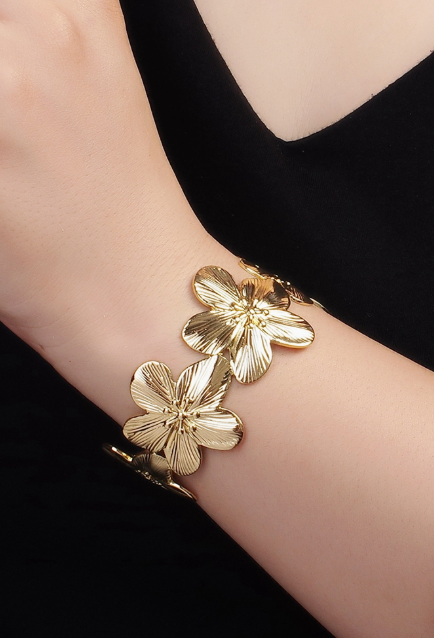 A shiny gold floral cuff; the perfect statement to finish any feminine look. 1.25" wide; Brass, Gold Filled- Lead Free, Nickel Free