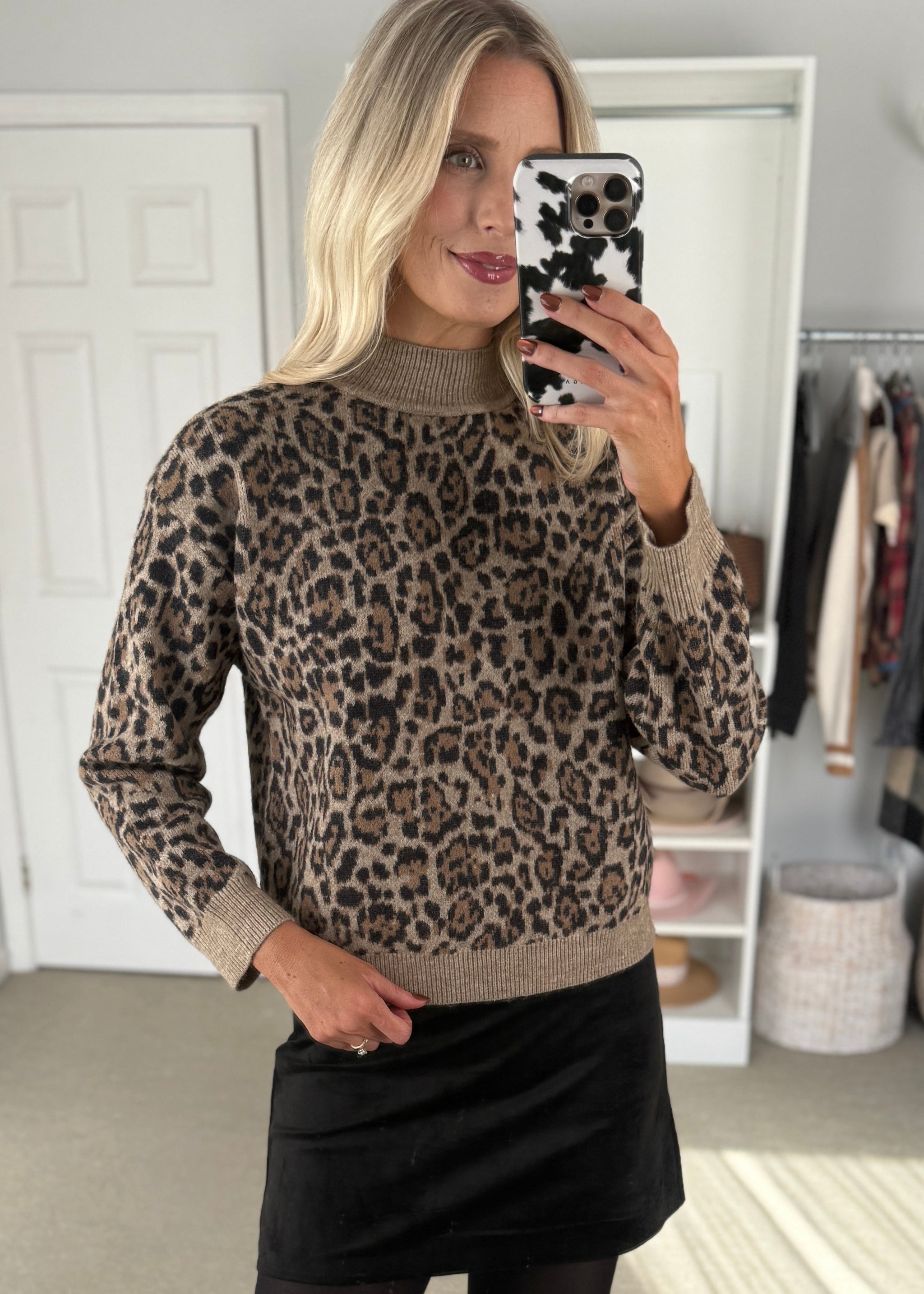 Animal print has become a classic and this sweater is a must! A cute boxy cut is accented with a ribbed mock turtleneck, cuffs and...