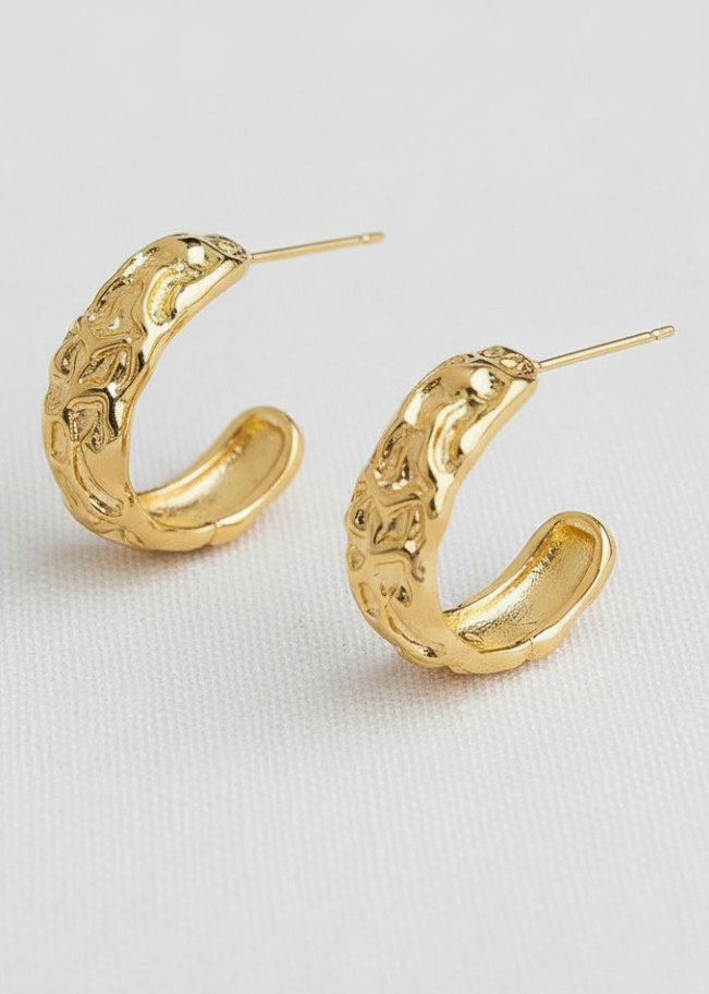 Unique texture gives these gold-tone hoops an interesting look. Keep away from moisture for long life. 0.75".