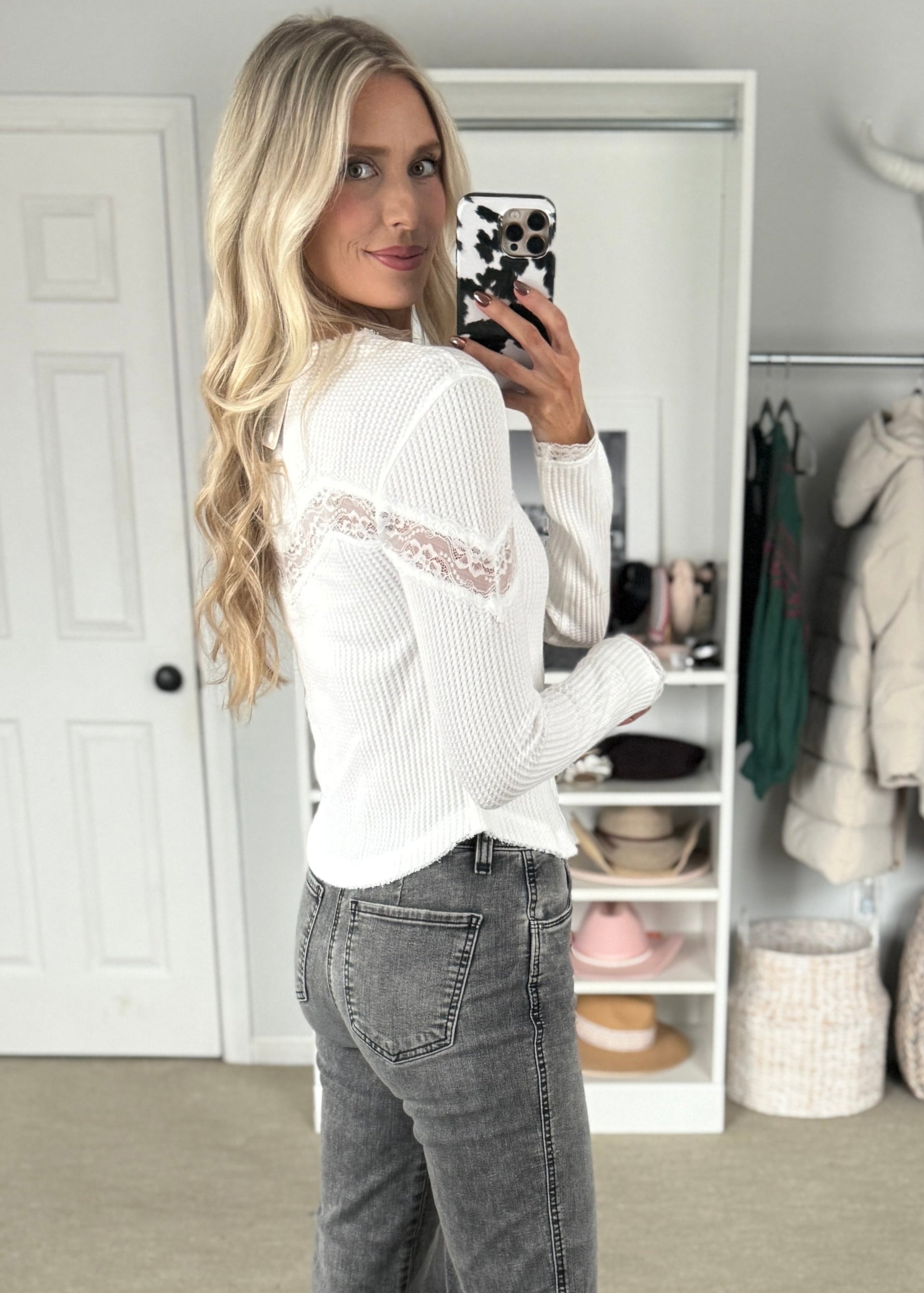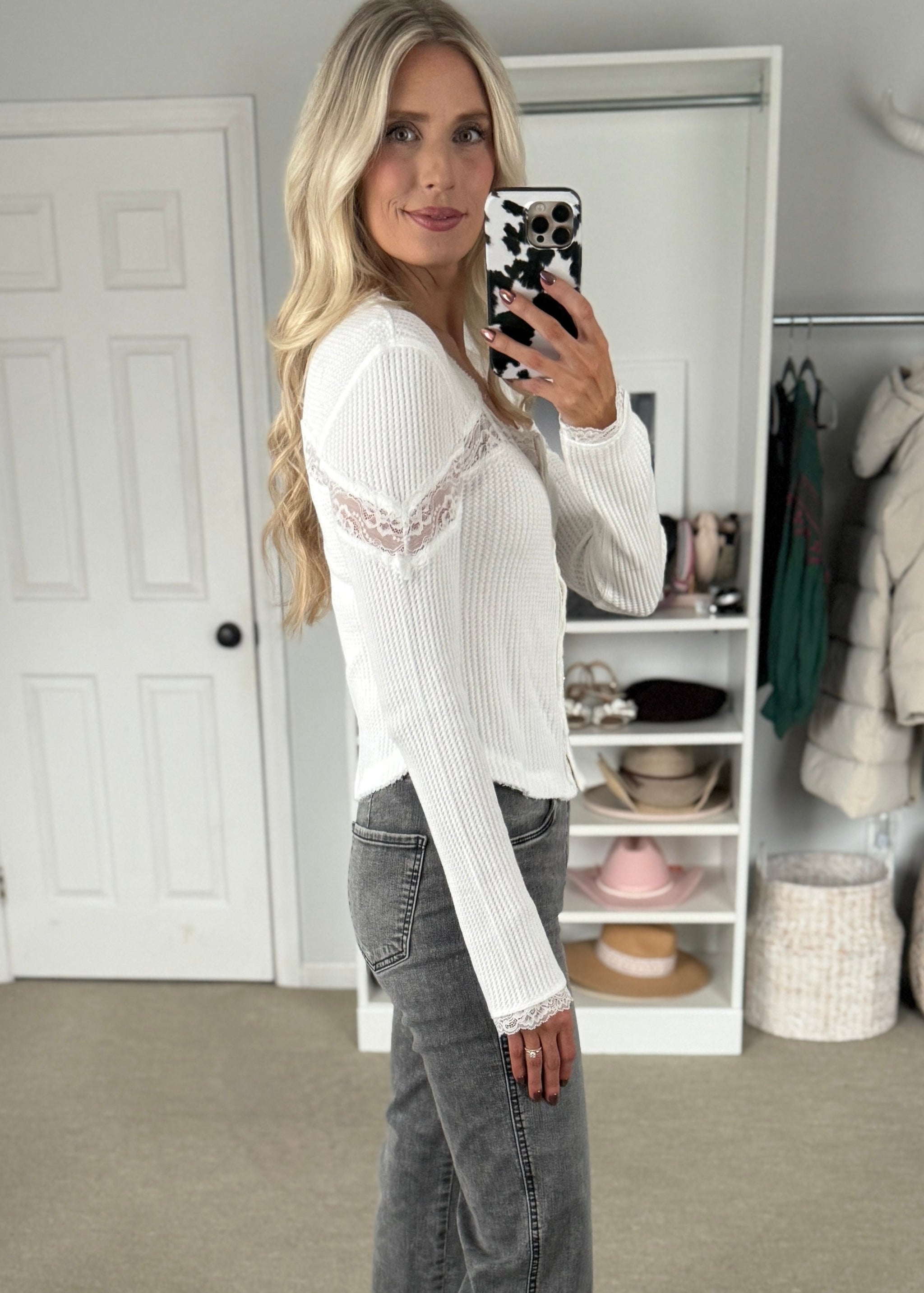 Lace trims give this pure white waffle-knit full button front the perfect feminine touch. Lovely shape that is so flattering but not too fitted. True...