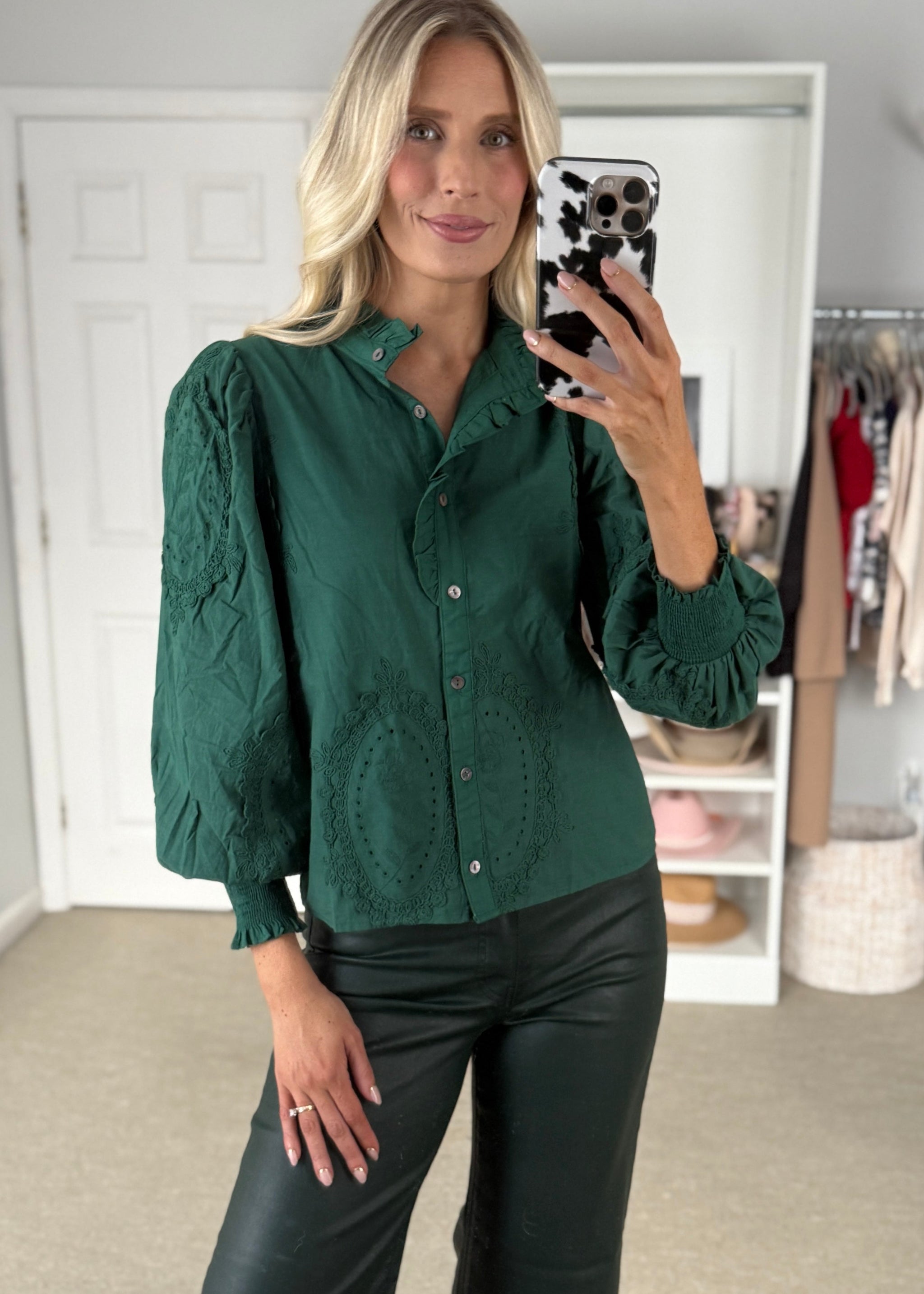 An elegant top to wear from the office to a holiday party. with embroidered appliqué, a partial ruffle on the placket and around the collar,...