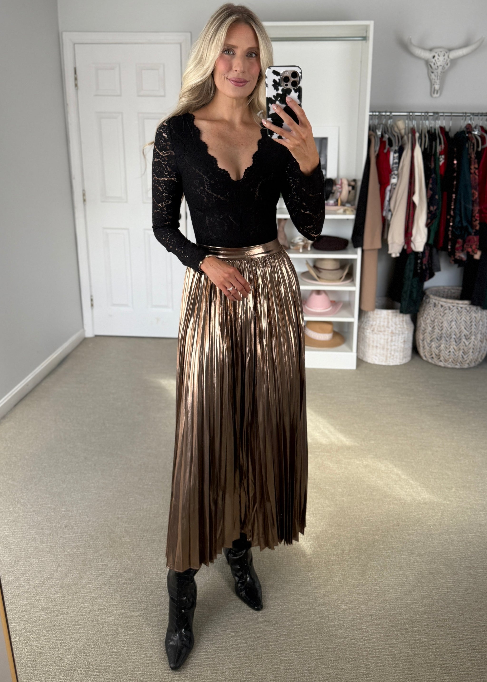 This coppery pleated skirt is a stunning holiday piece you will have and love foreber! With a wide waist, it's elasticized at the back for...