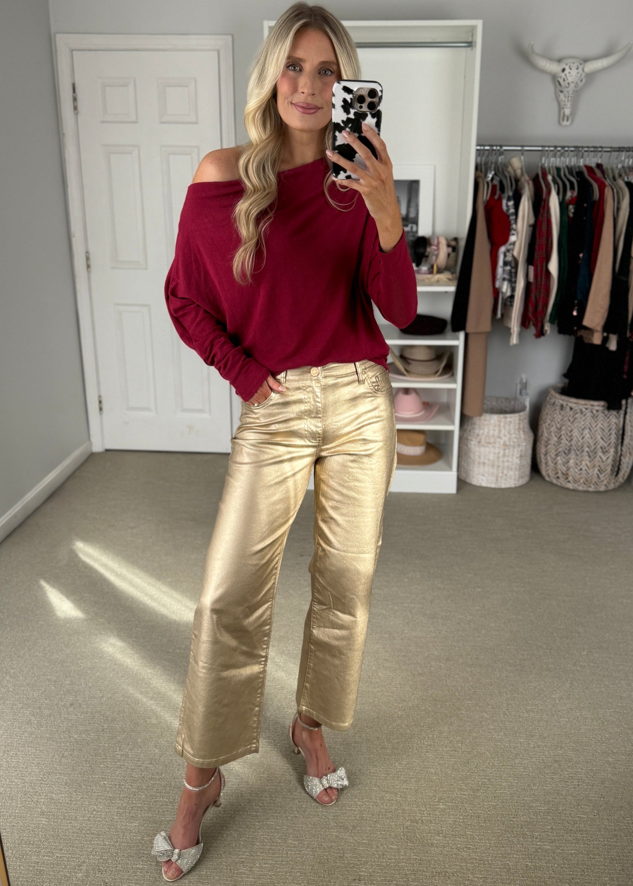 The ultimate statement pant designed to elevate your holiday style. This high rise, straight leg silhouette features a dazzling metallic coated gold finish that radiates...
