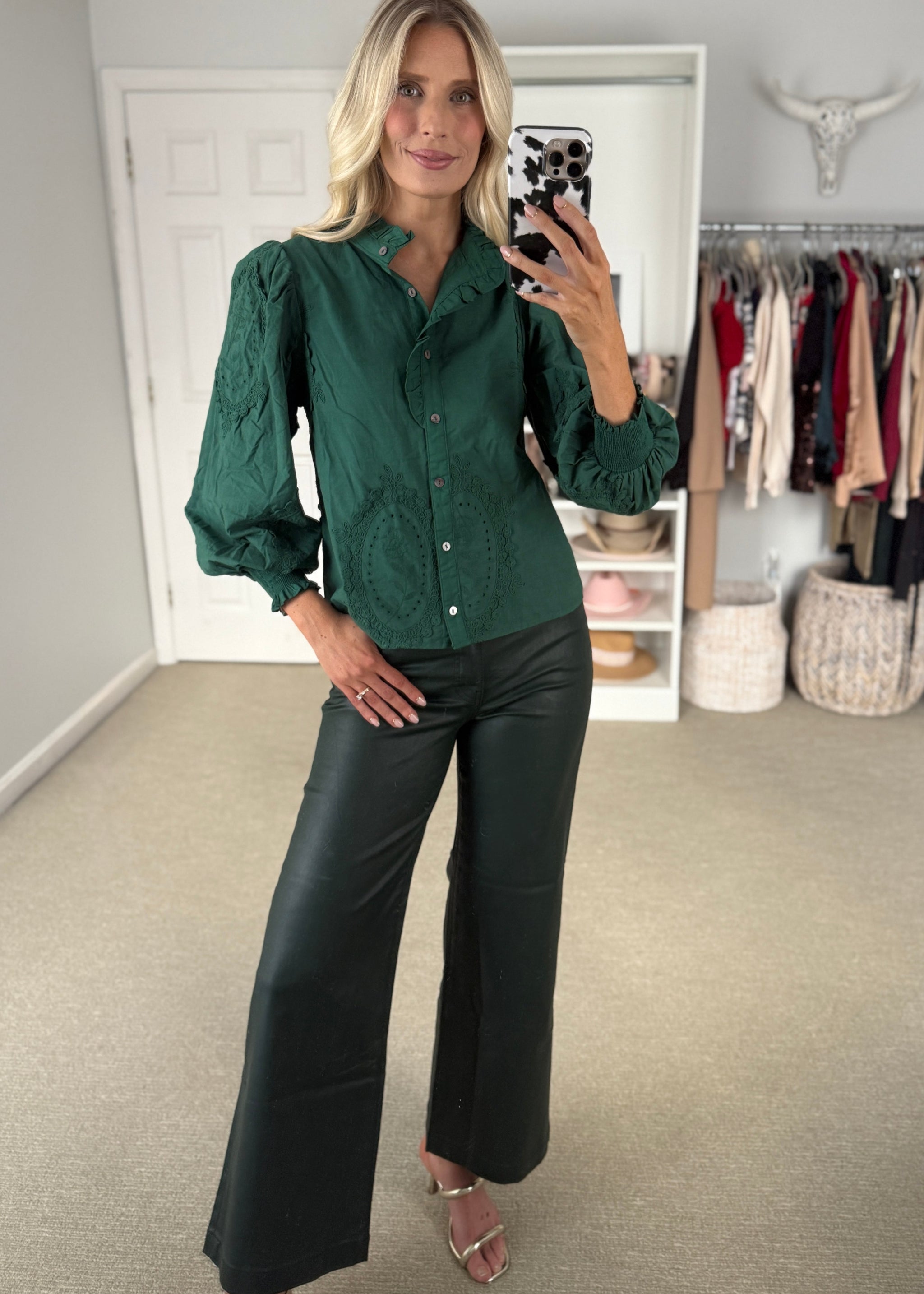 KUT sizing. Coated wide leg stretchy denim in green. 59% MODAL, 39% POLYESTER, 2% LYCRA
