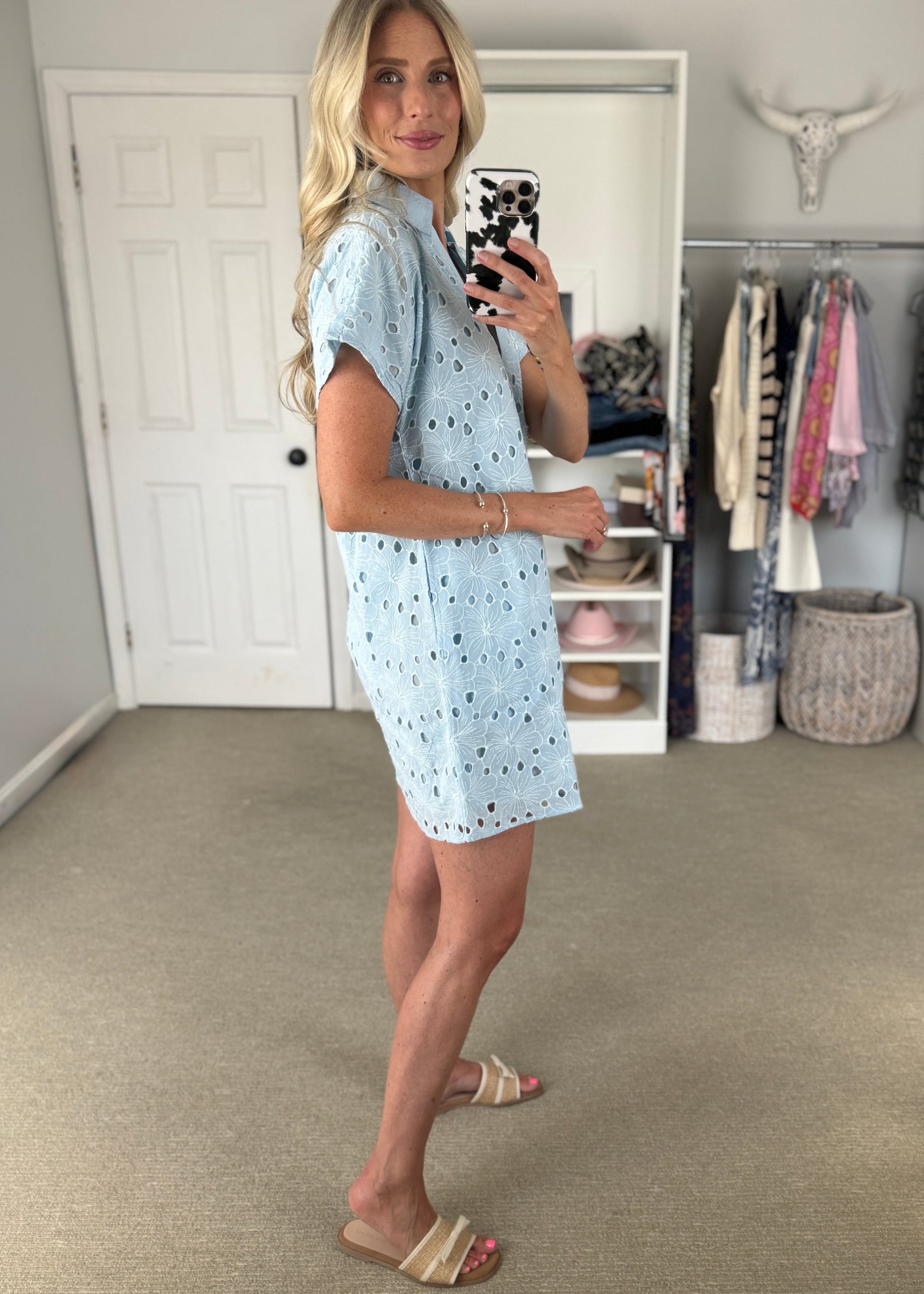 blue eyelet shift style dress with collar. Lined with pockets. True to size.