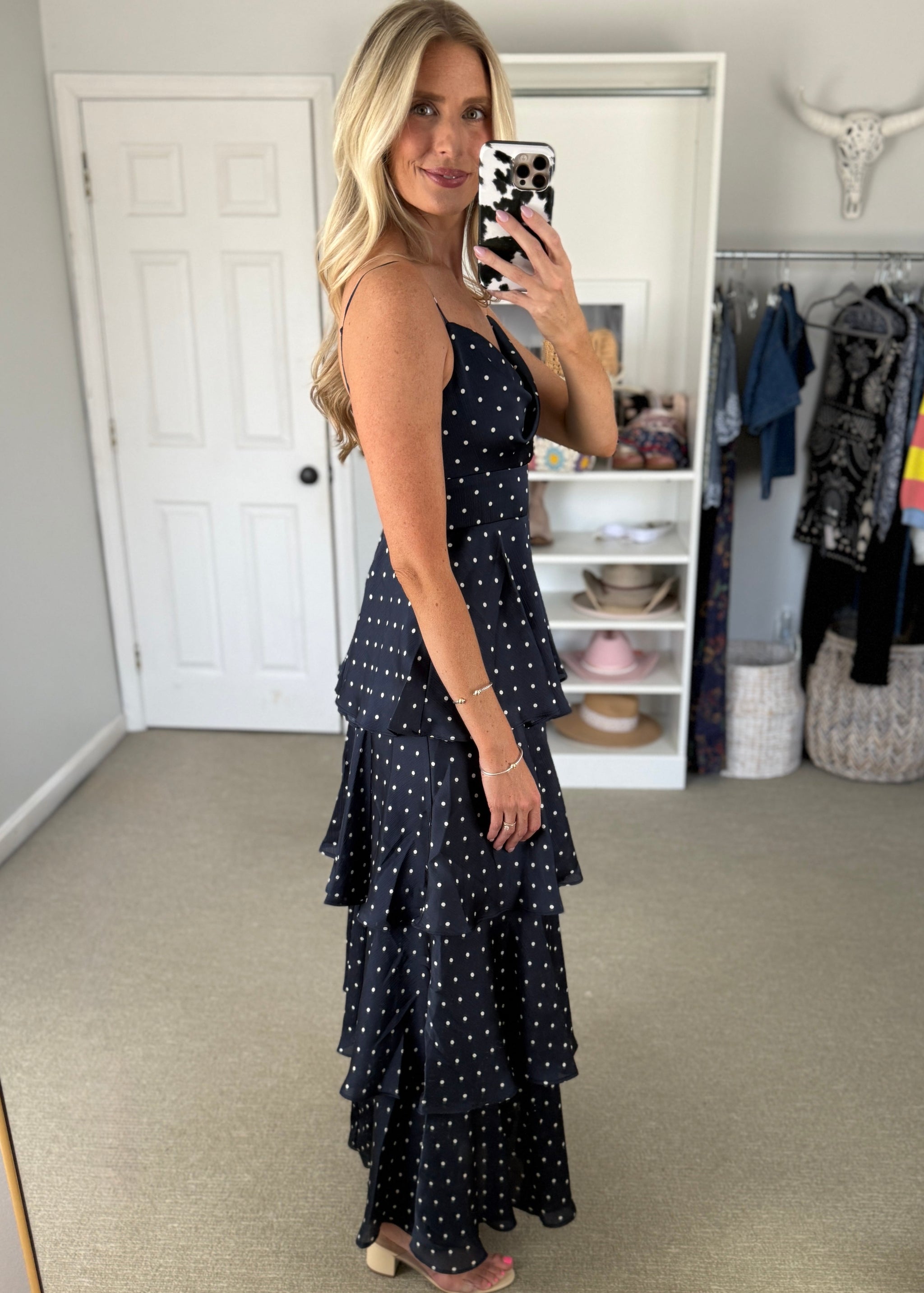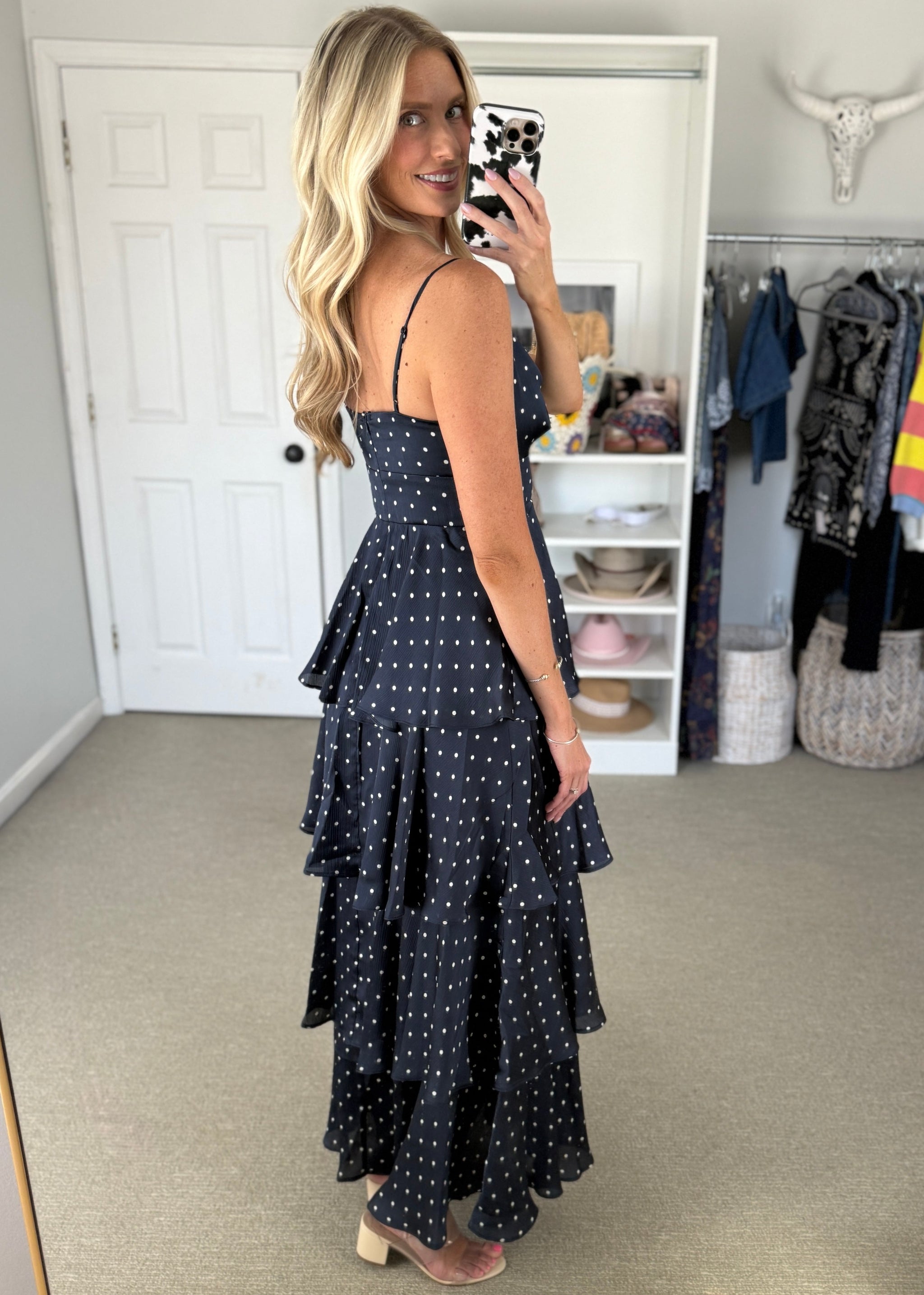 Full length navy polka dot dress. Tiered with adjustable straps. True to size.