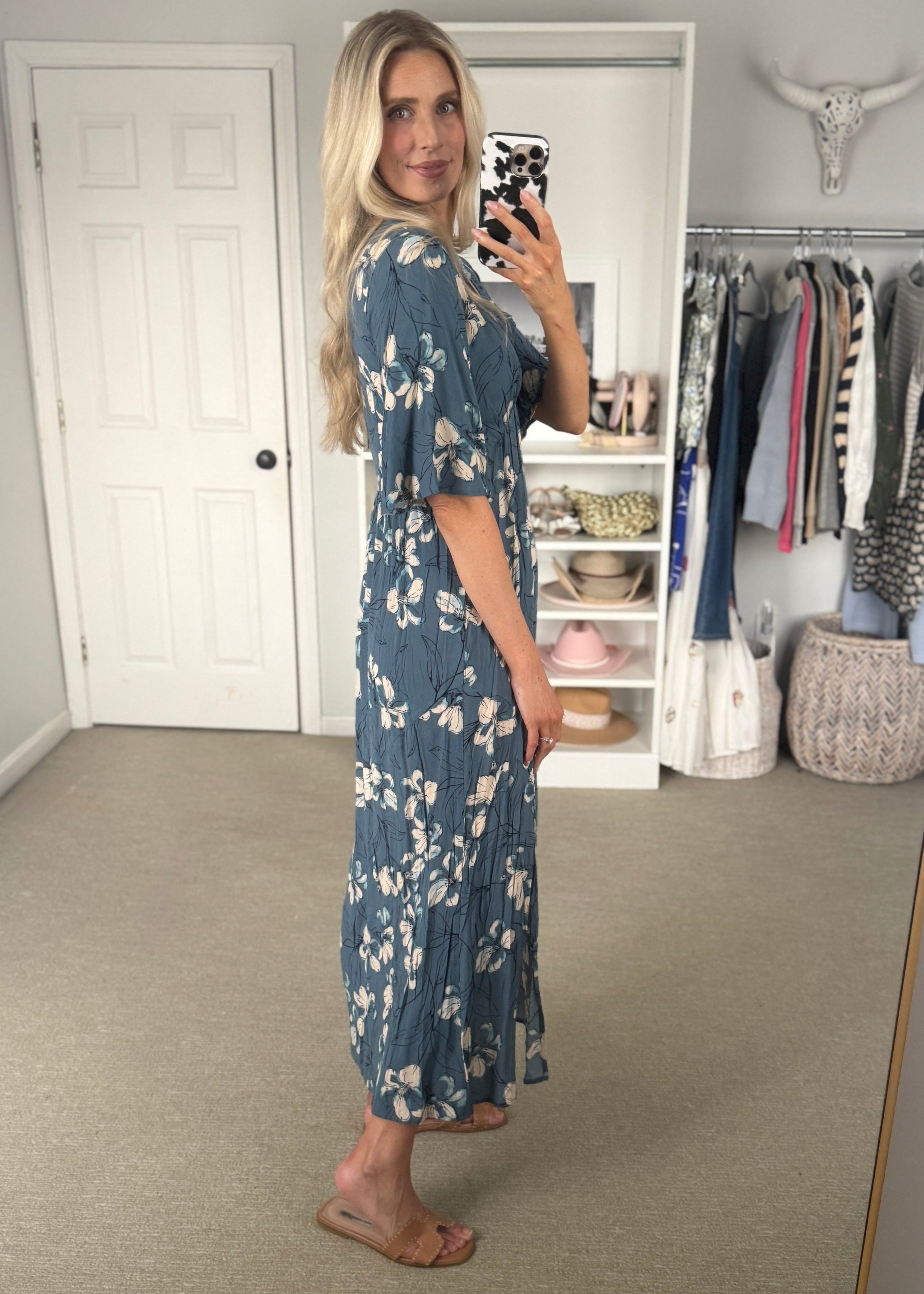 A timeless maxi dress featuring a teal and ivory floral print. Floral print Relaxed, flowy fit Short flutter sleeve Deep v-neckline Maxi length Empire waist ...