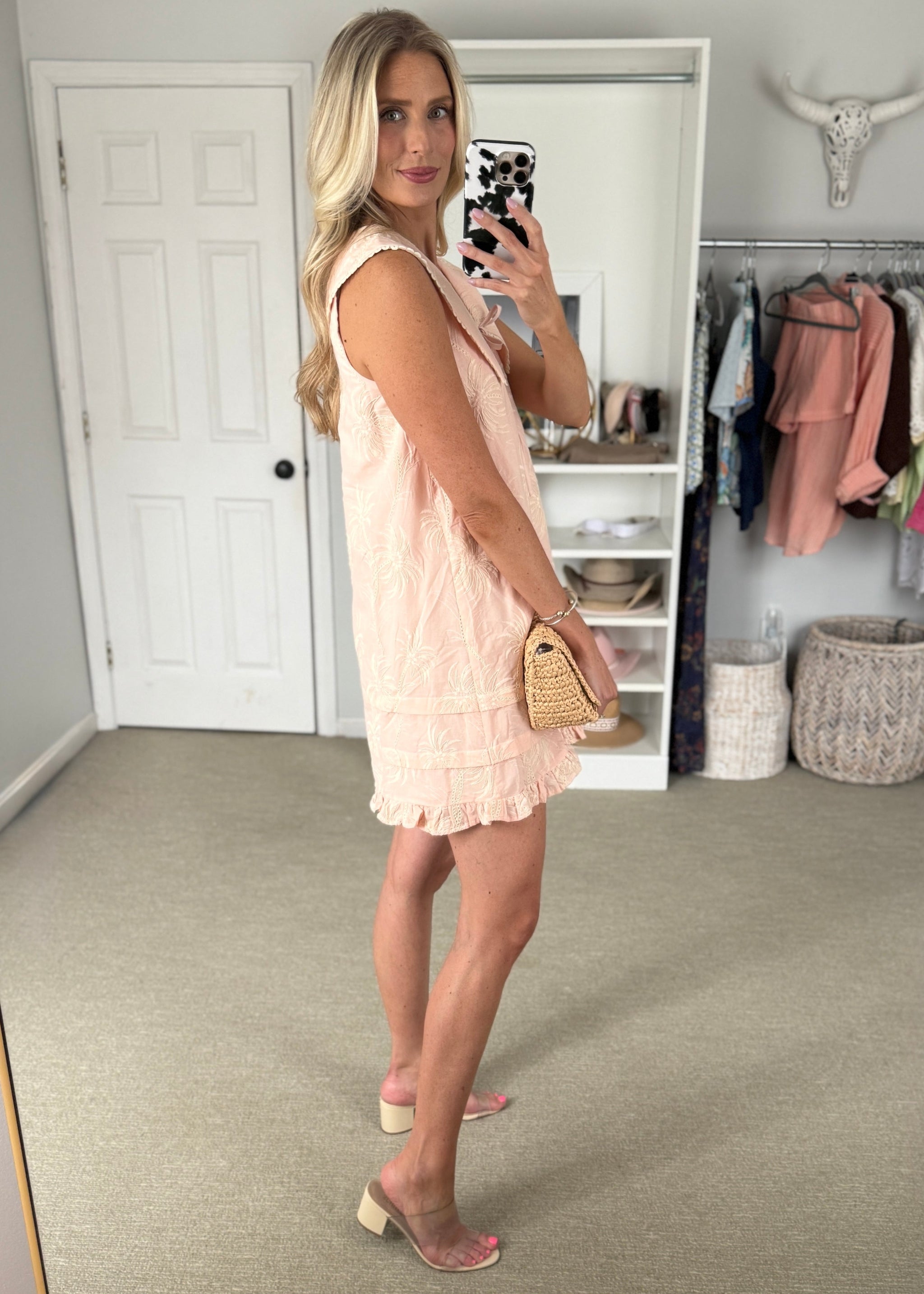 light blush dress with embroidered palm tree print and beautiful collar detailing. True to size.