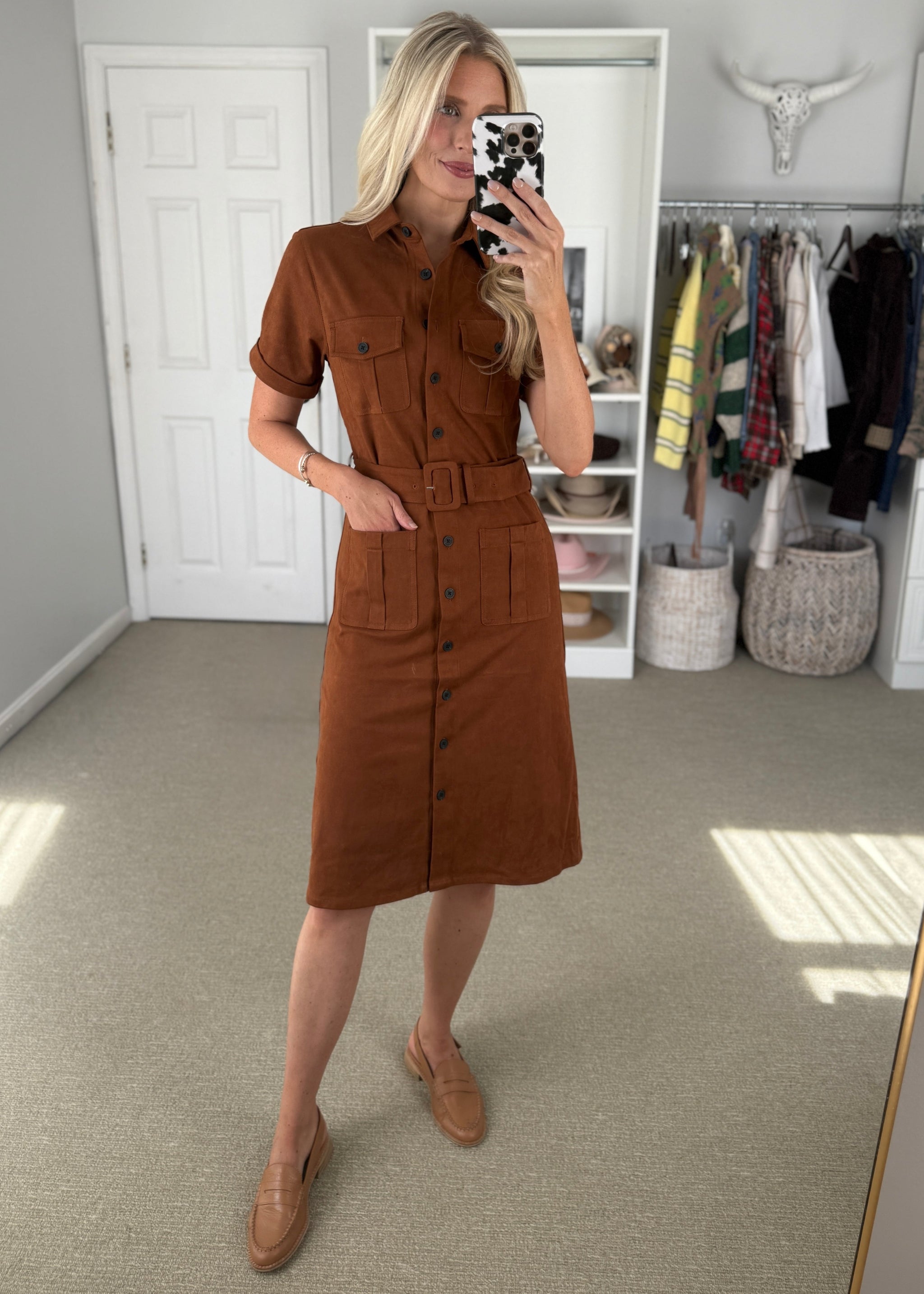 SHORT SLEEVE SELF BELT 90% POLYESTER 10% SPANDEX. True to size, faux suede material has great stretch.