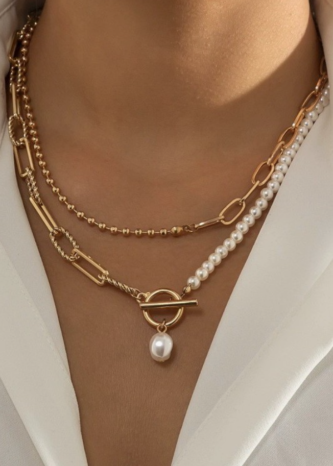 A Double Layered faux pearl Necklace; sophisticated and stylish and very versatile. Designed with a chic front toggle clasp, this elegant piece adds depth and...