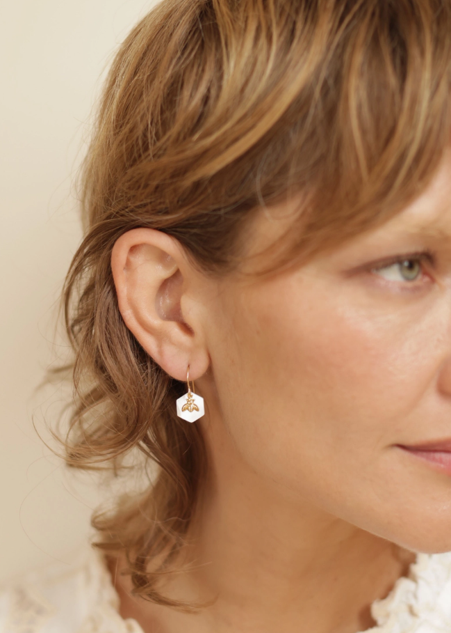 These earrings feature luminous 12mm Mother of Pearl hexagons layered behind a tiny bee. They hang from 14k gold fill ear wires. 0.75" dangle and...