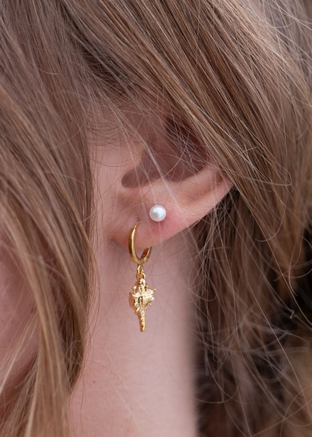 These shell huggie hoops will be the perfect addition to your summer earring stack. made of 14k gold plated brass, lead and nickel free. 1.0"...