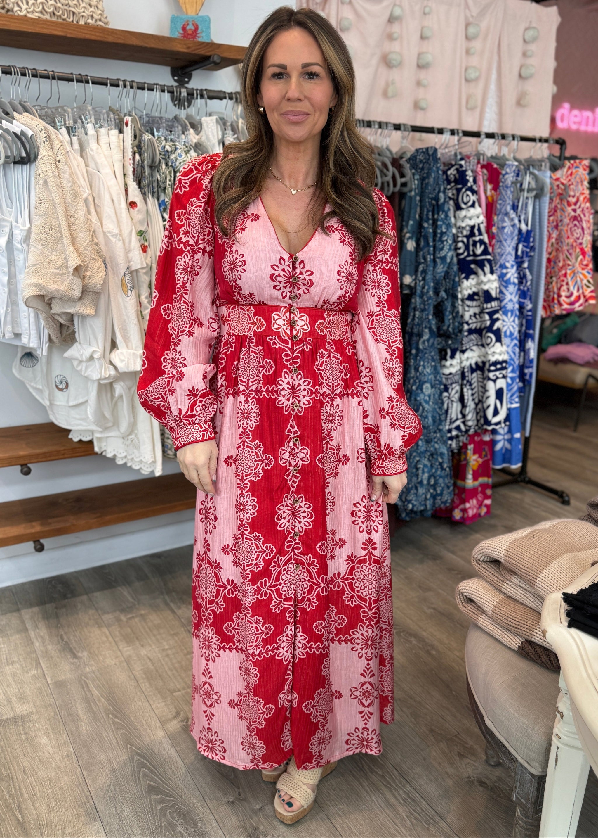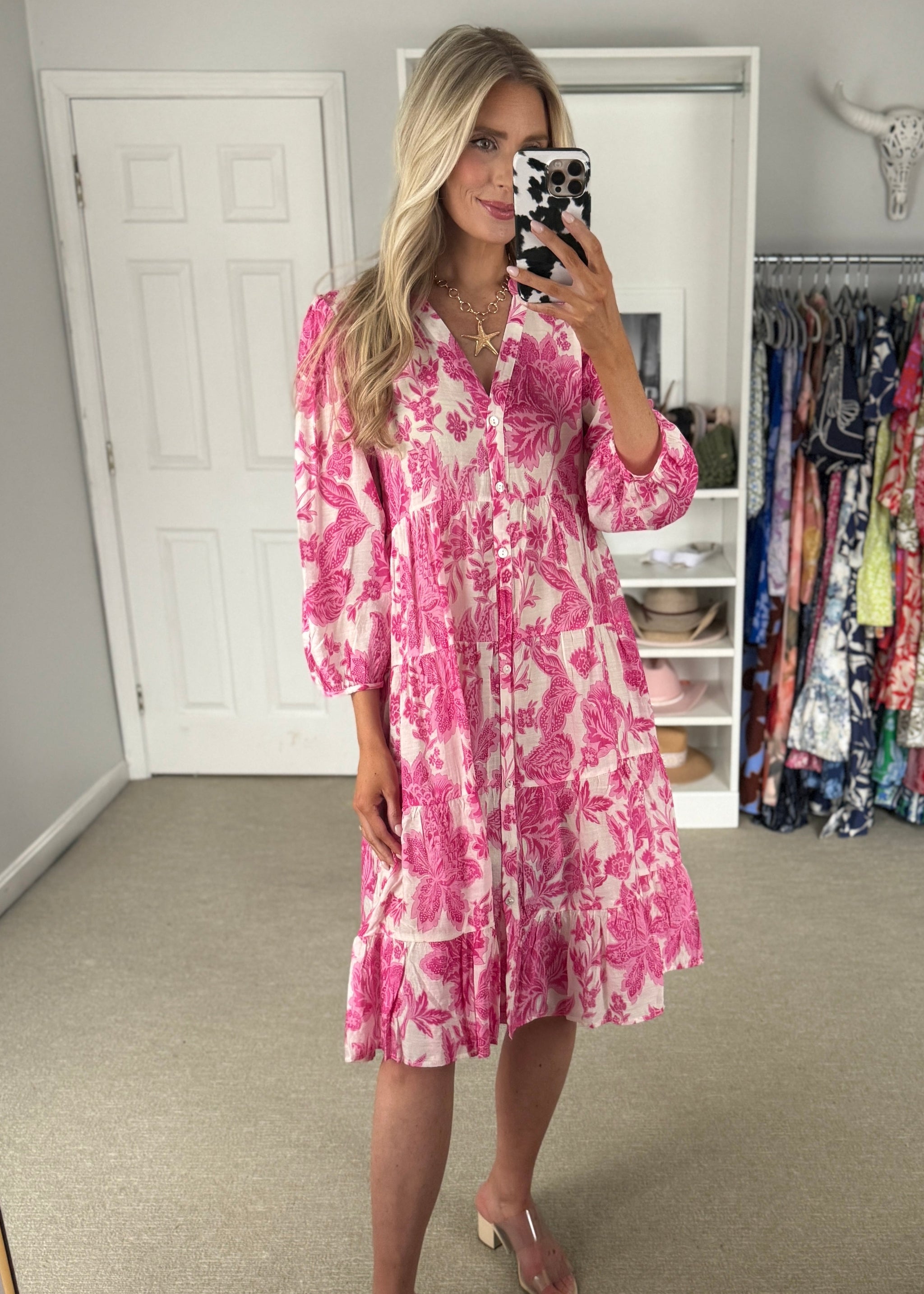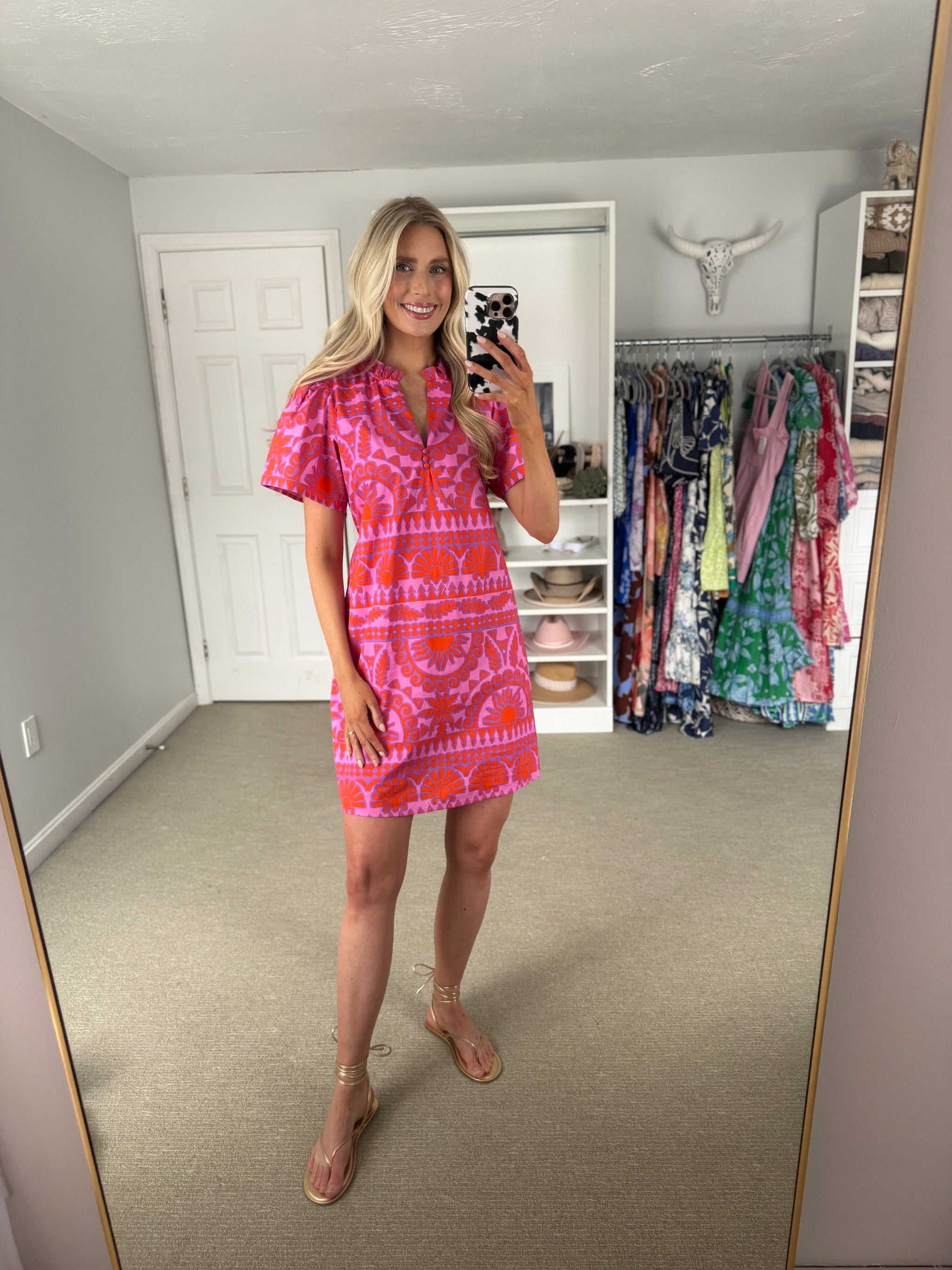 Bright pink patterned dress with tie belt. 100% cotton. True to size.