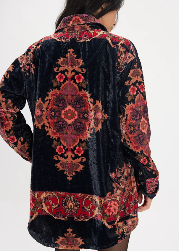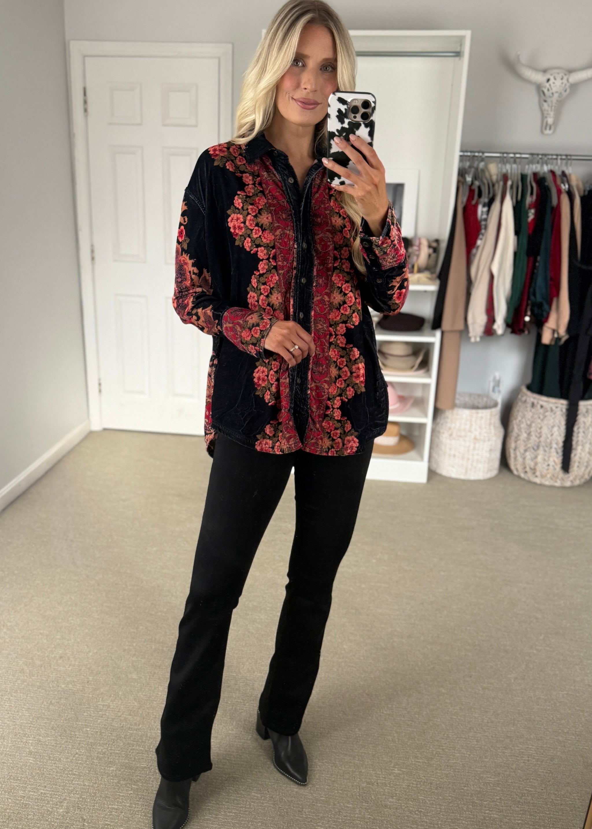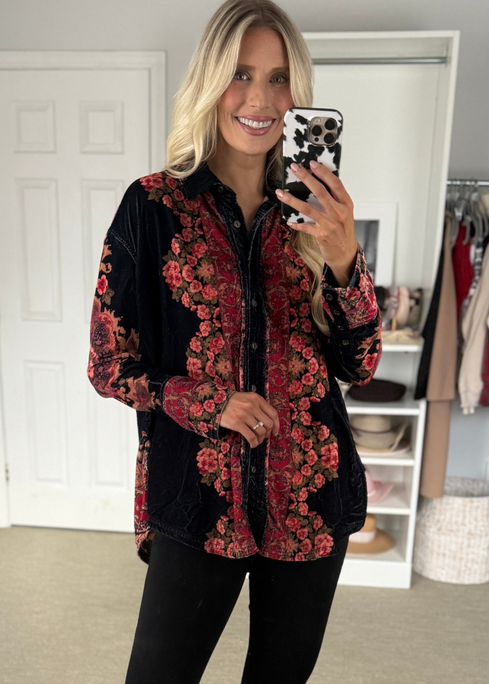 The perfect pop of print from the We The Free collection. This button-down features a soft velvet fabrication and cool contrast floral print with dropped shoulders...