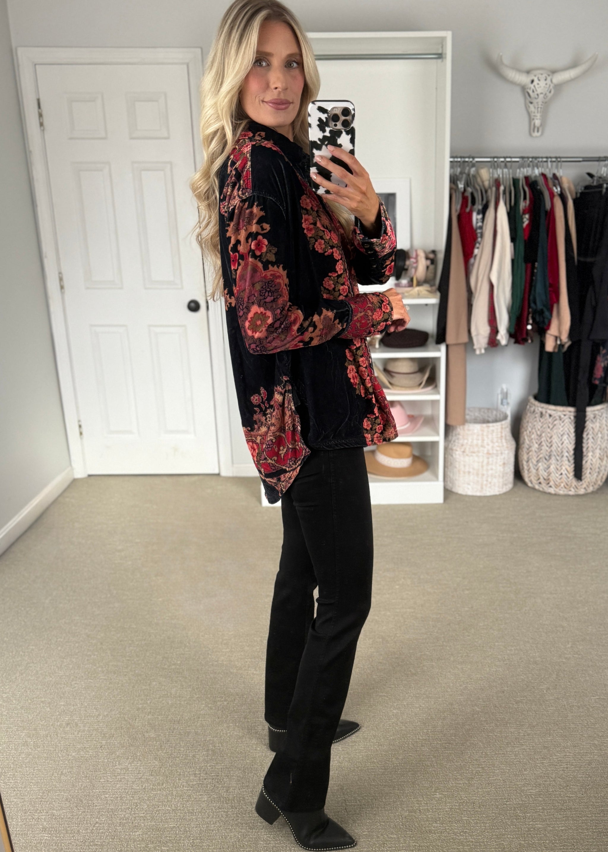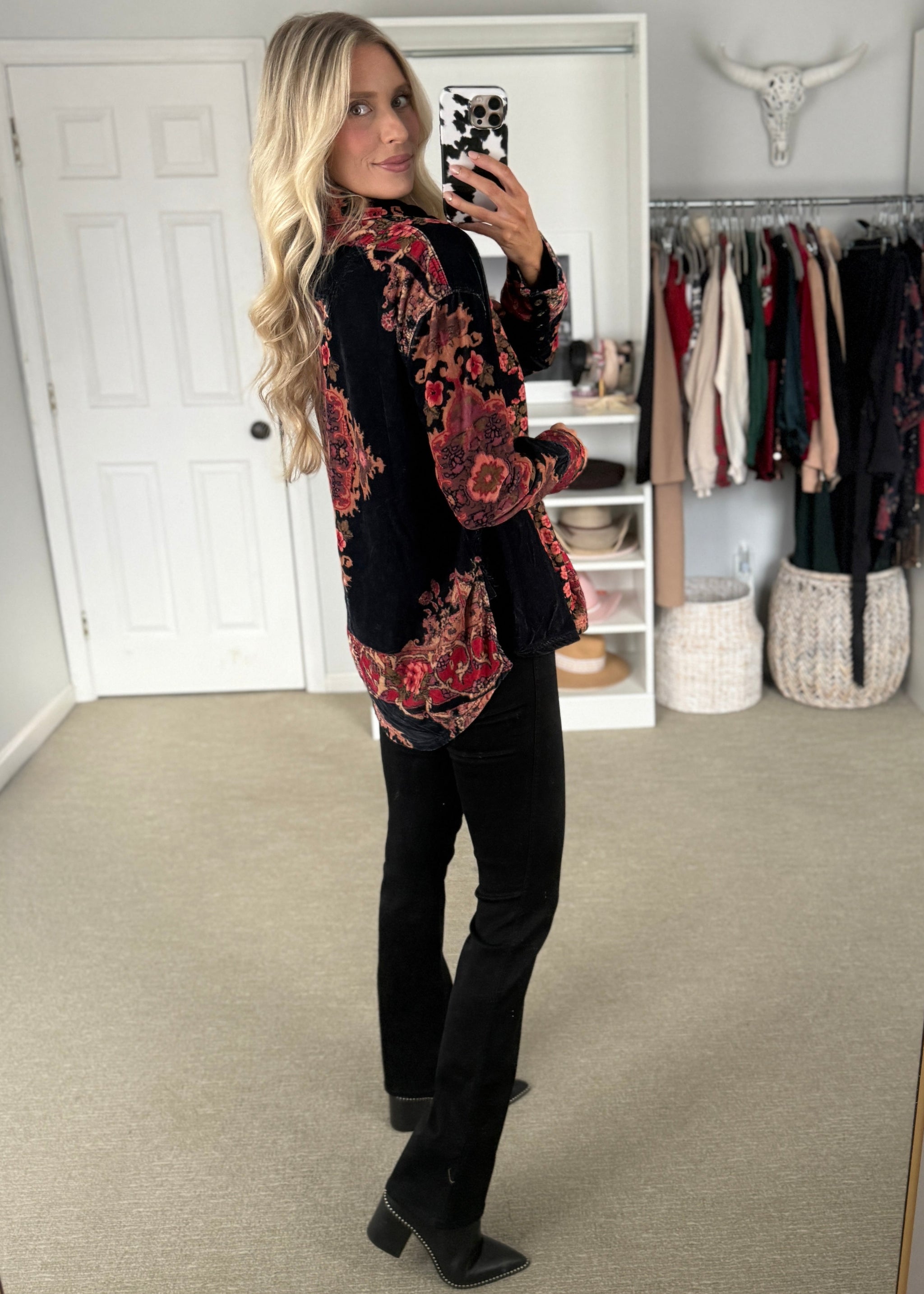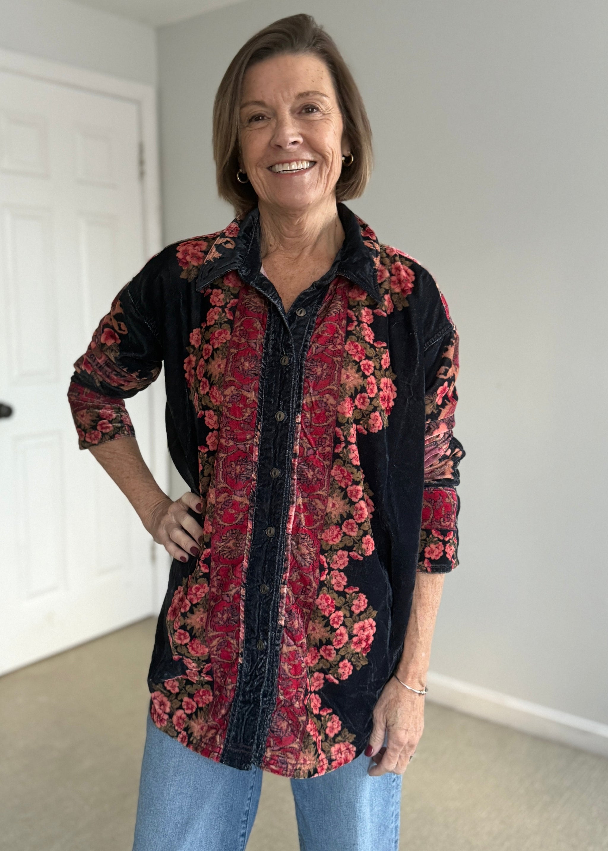 The perfect pop of print from the We The Free collection. This button-down features a soft velvet fabrication and cool contrast floral print with dropped shoulders...