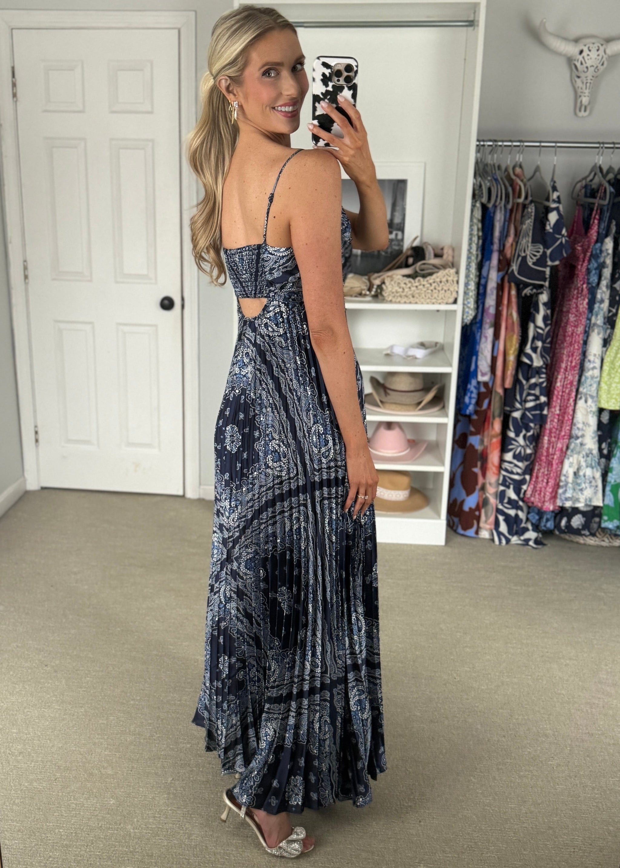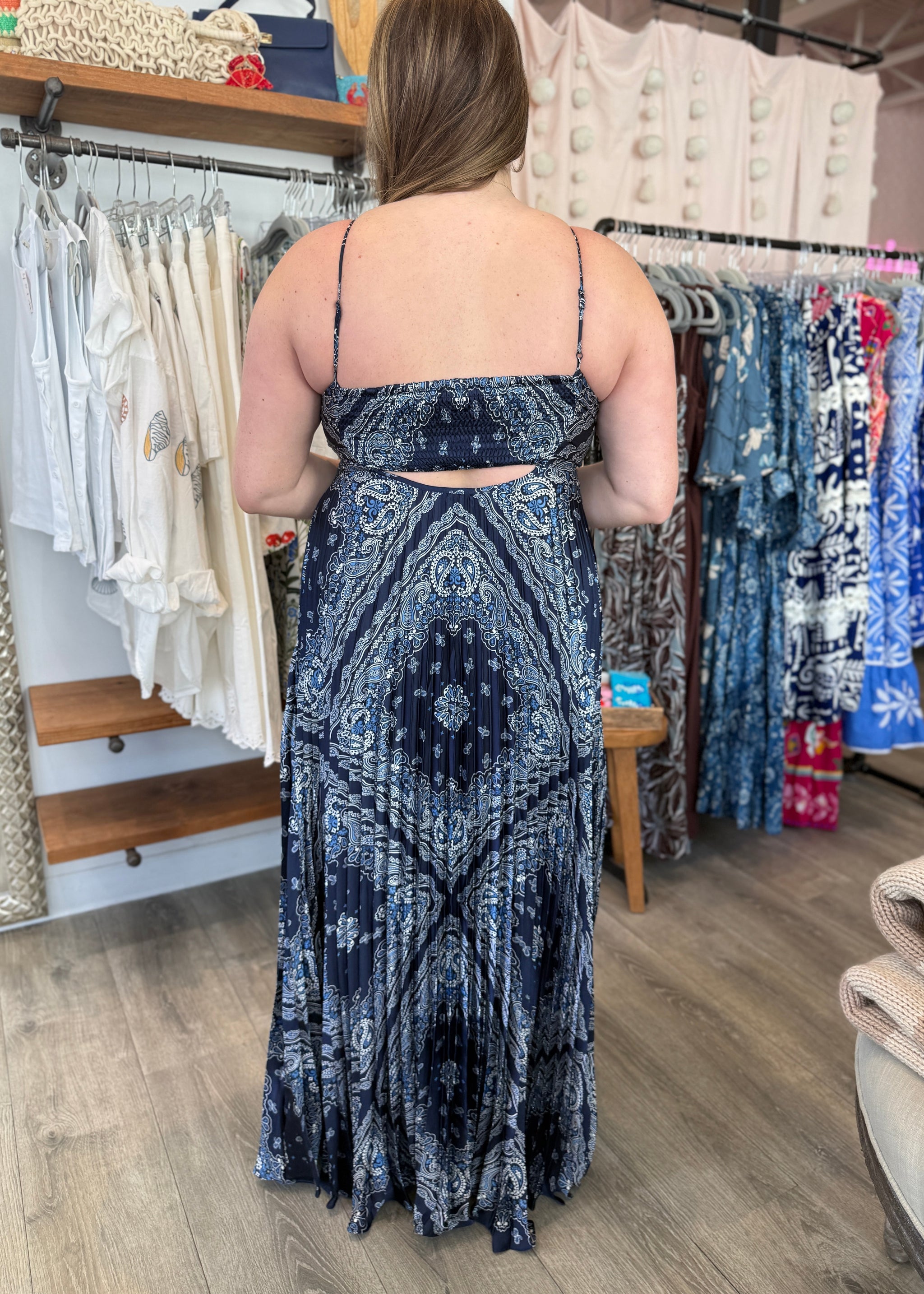 Long satin material navy patterned dress with cutout in the back. True to size.