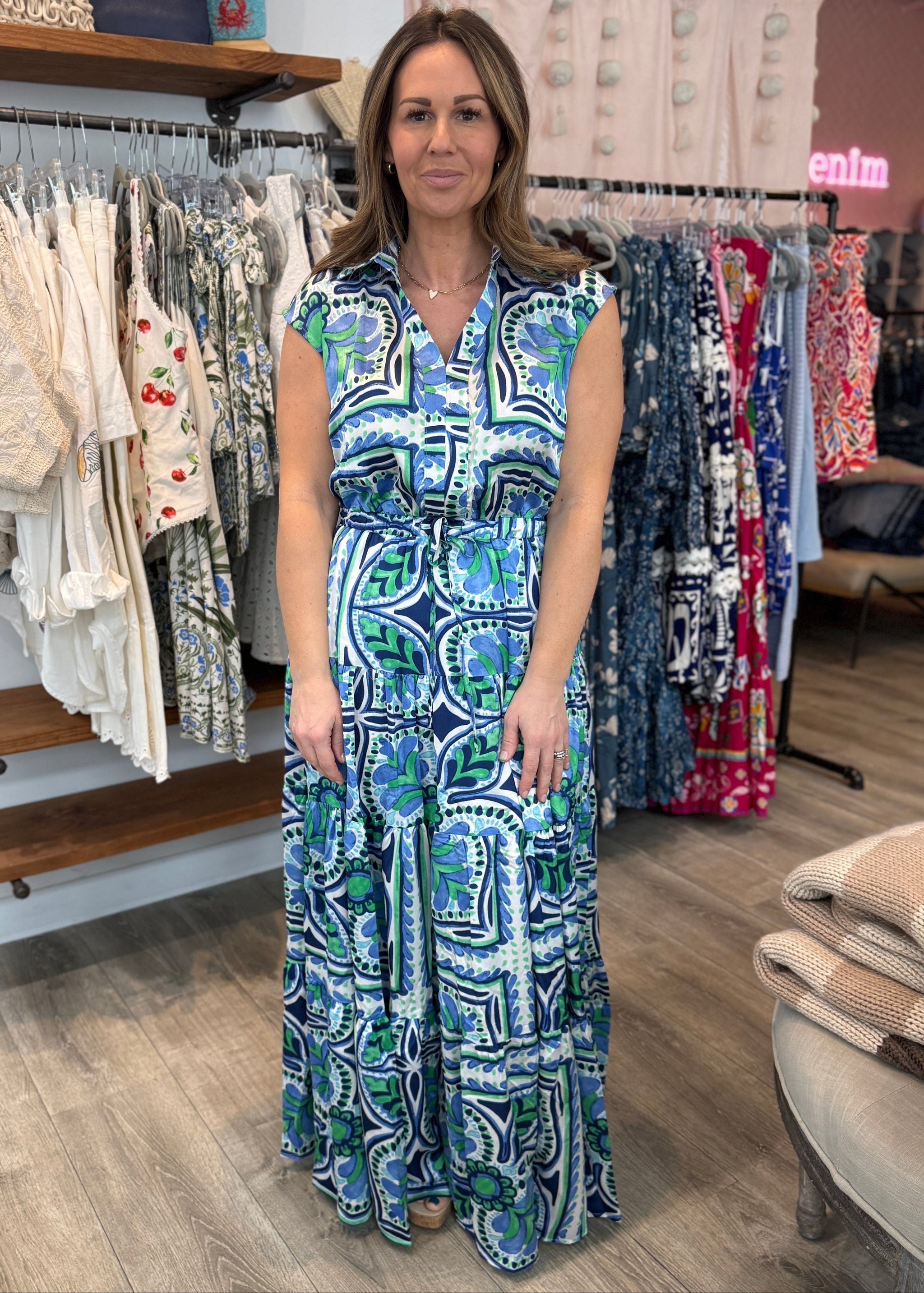 A summer shift-style dress in a vibrant floral print on a cream background. Including gorgeous shades of green and blue. True to size. Fully lined;...