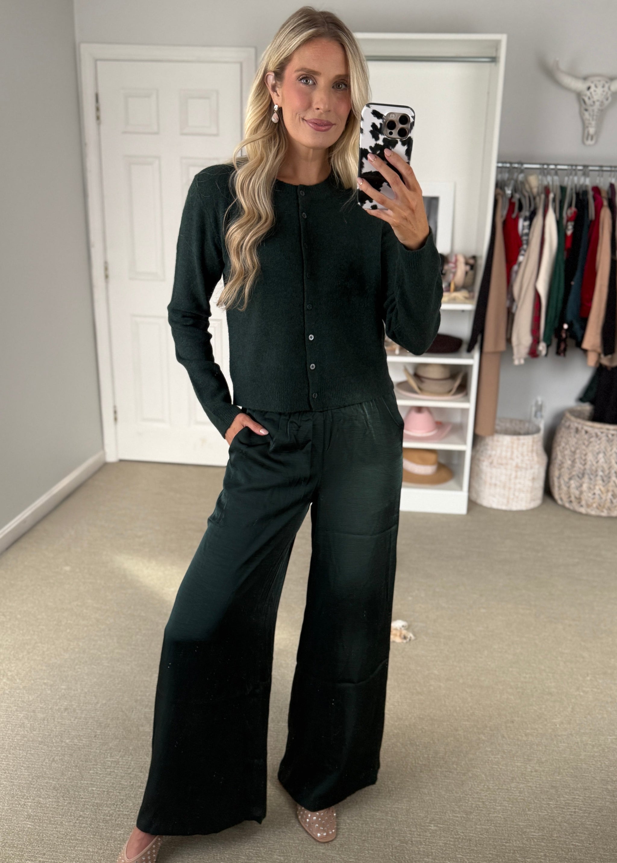 Our favorite dressy bottoms look, the wide leg flared pant is so flattering and perfect for a more elevated look. This pair in a fine...