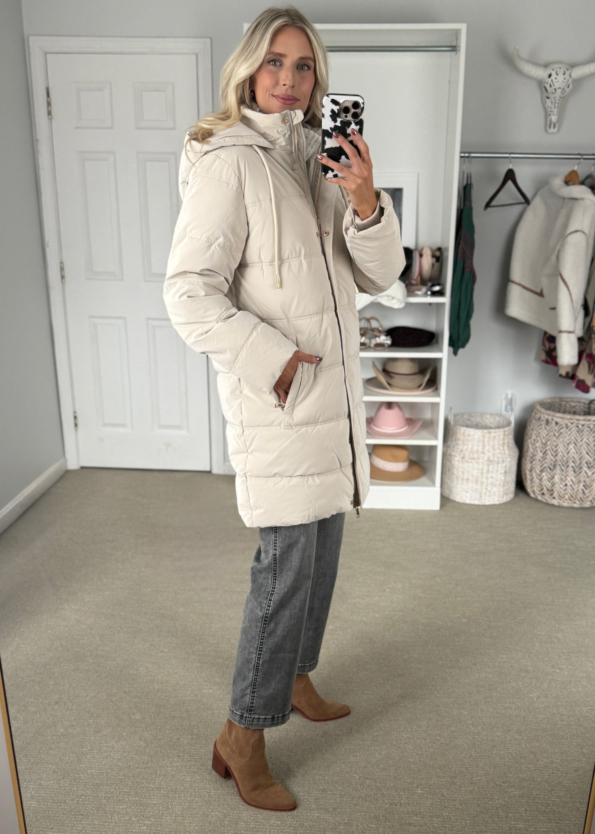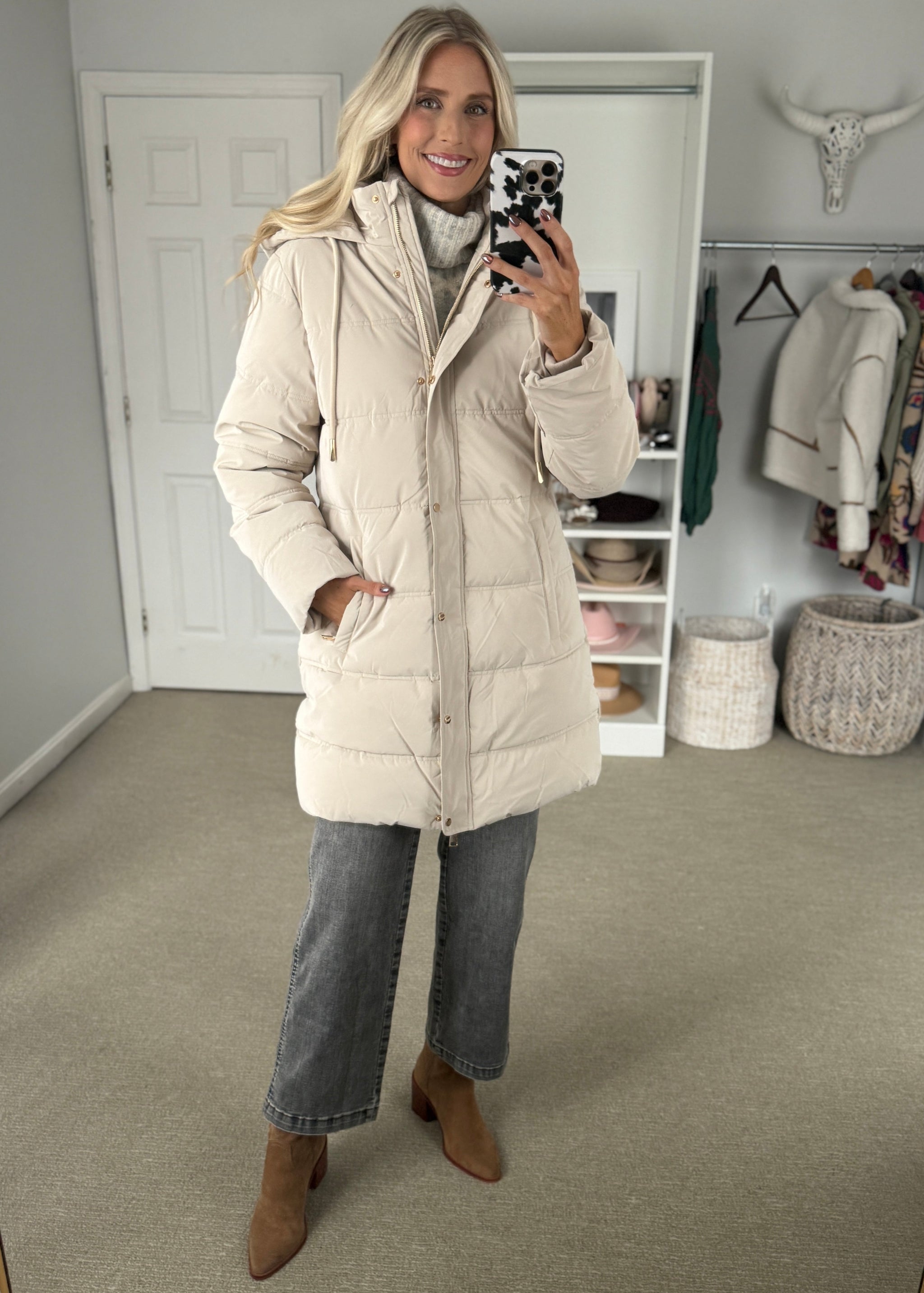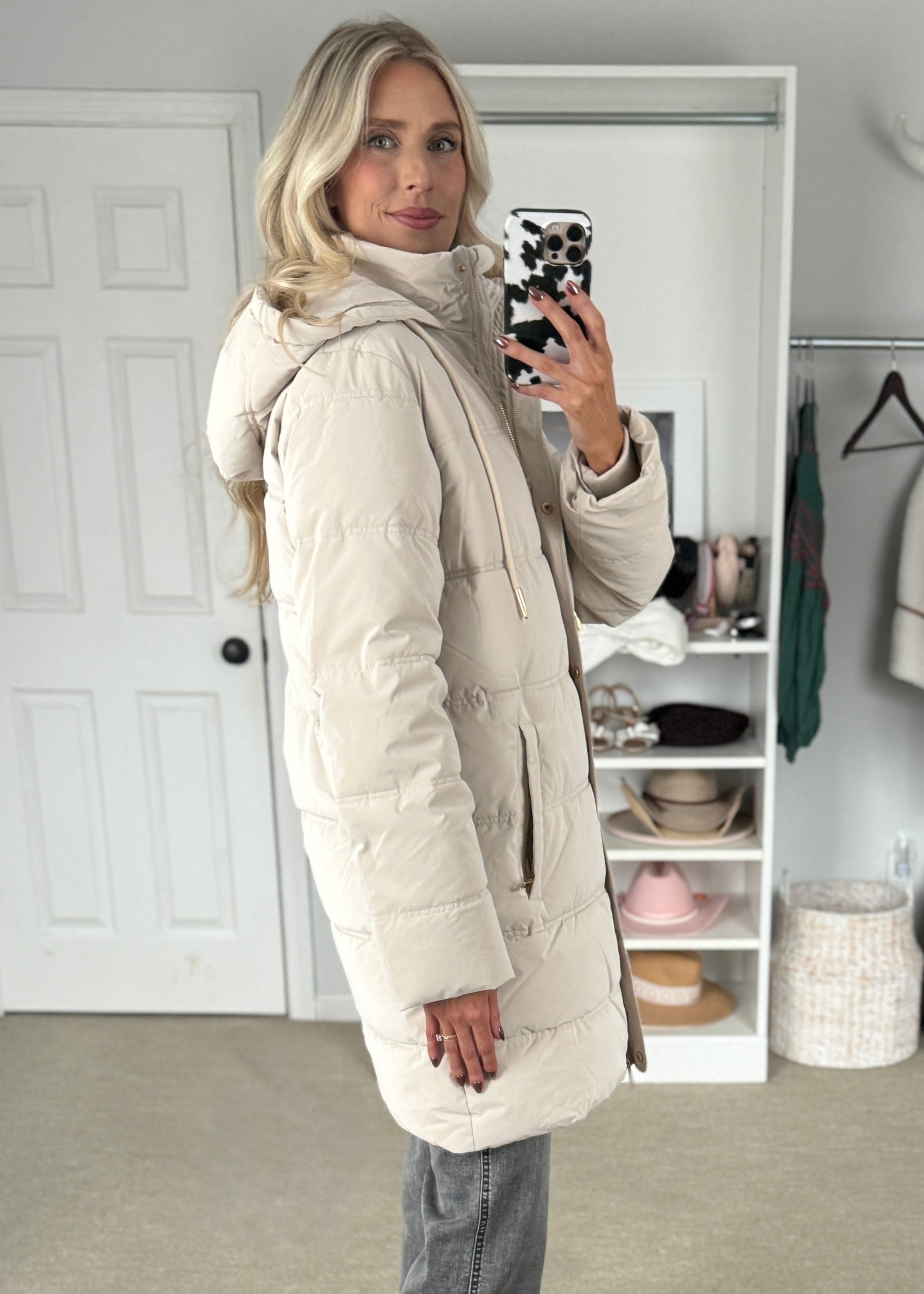 A luxe take on the classc puffer coat. Created in a beautiful light ecru and finished in sturdy gold hardware, this hooded coat also has...