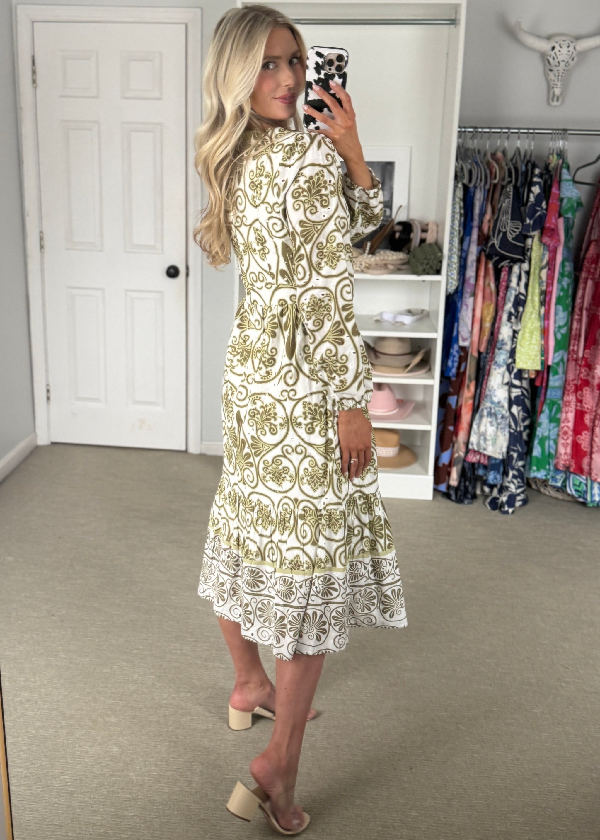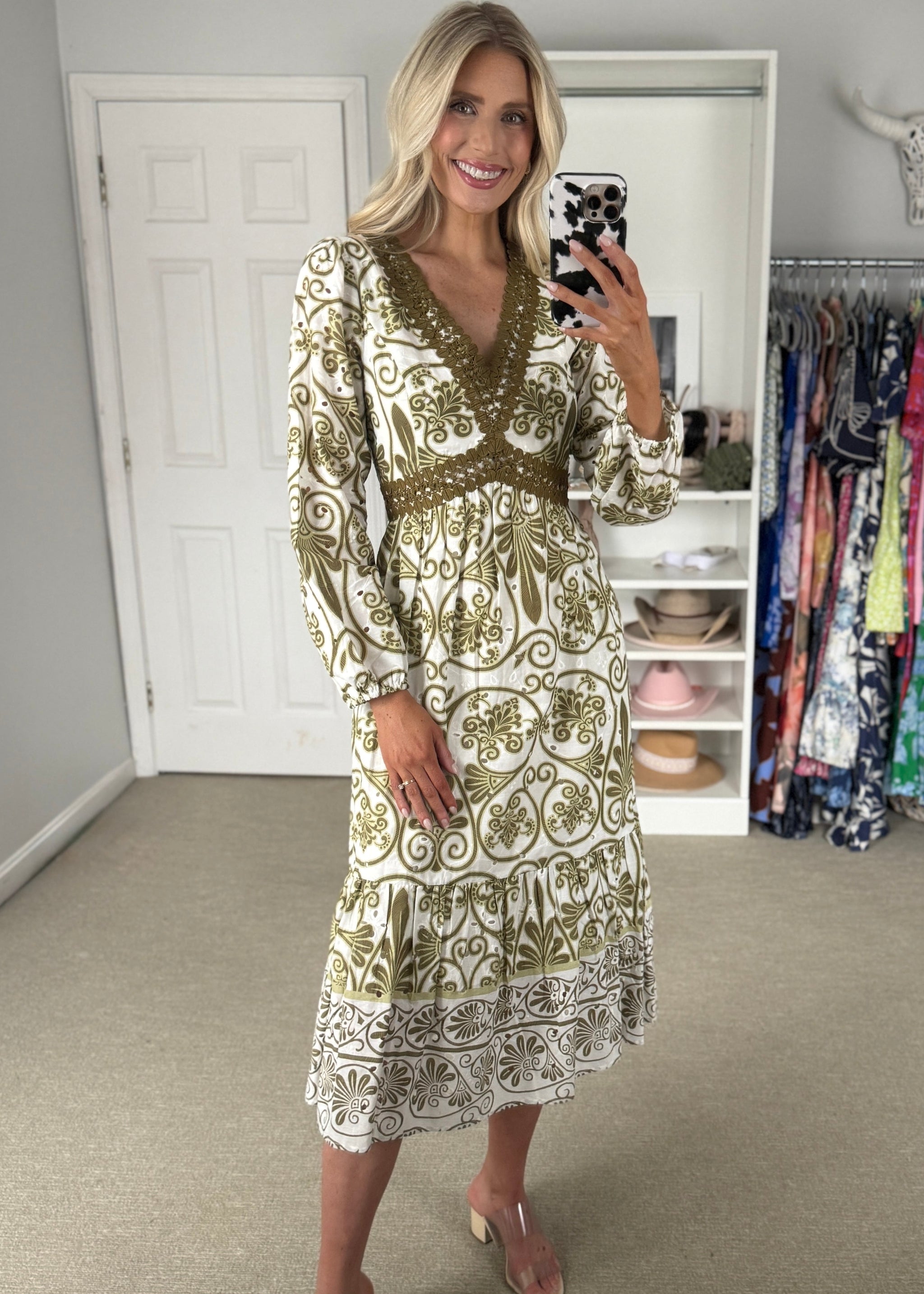 Featured in an Olive and Ivory color combination, this dress features long sleeves for coverage and a refined, defined silhouette. The stunning contrast trim adds...