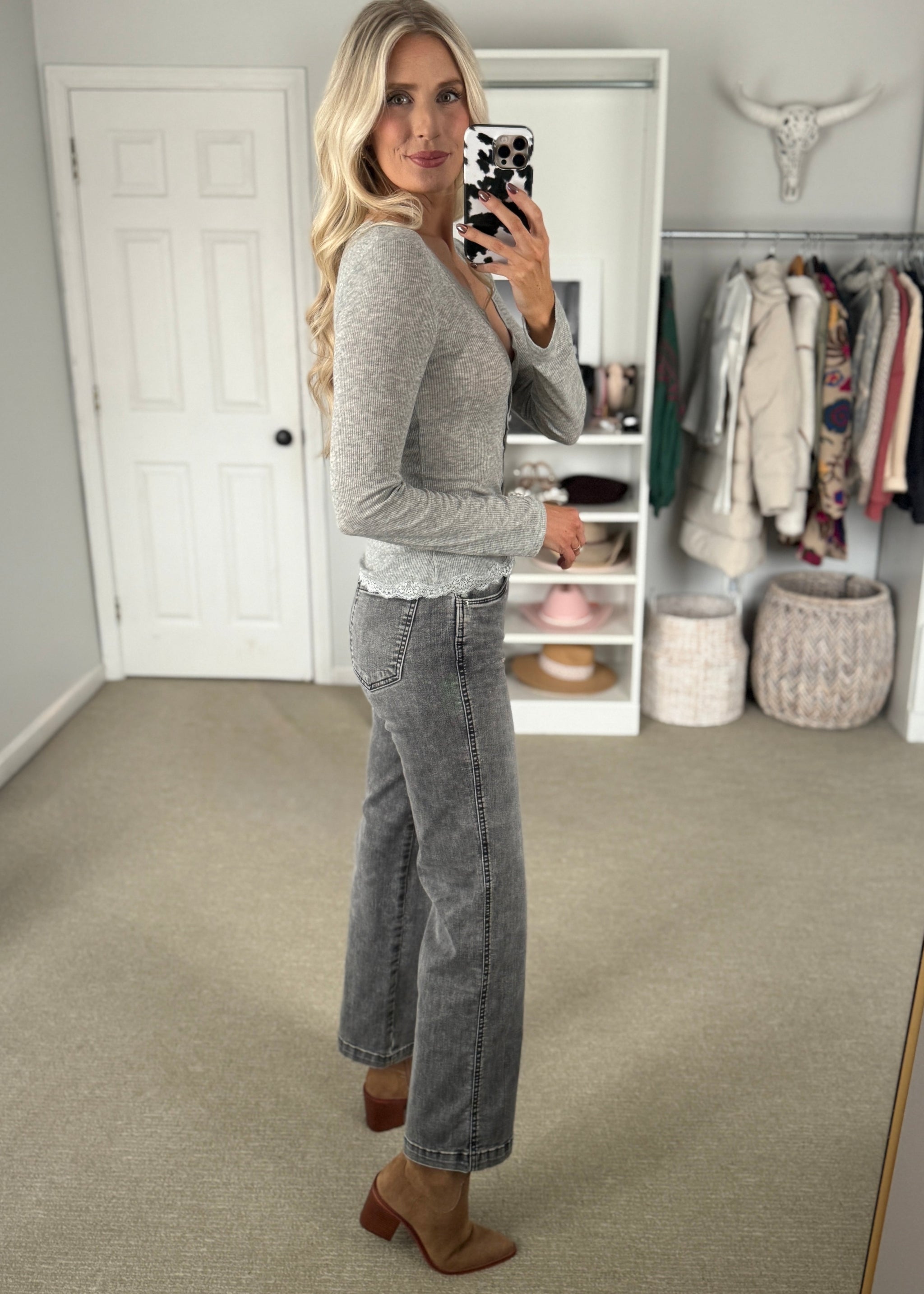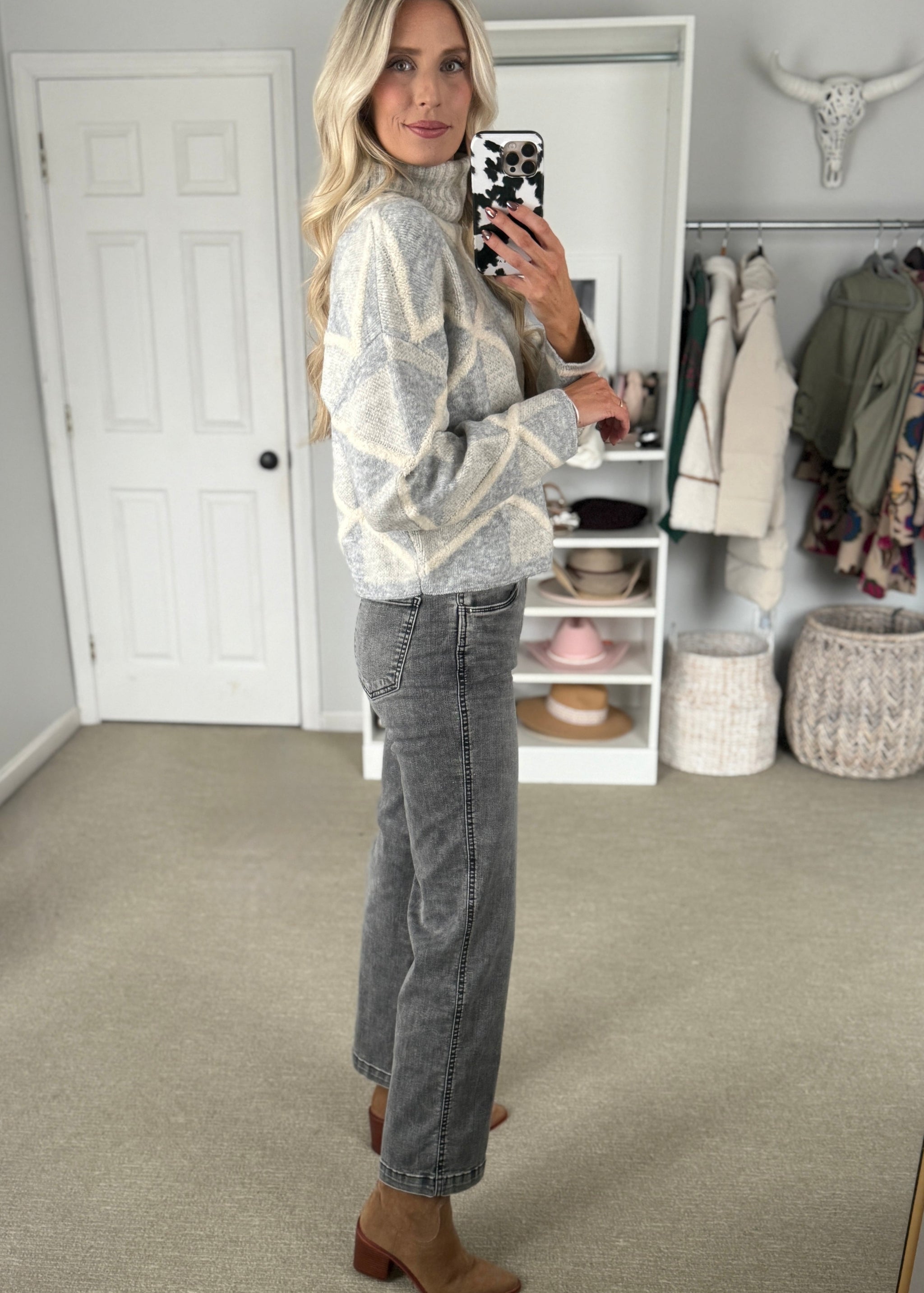 Traditional STRAIGHT leg, high rise jeans in a medium grey wash. Measurements for size 2: Inseam: 29", Leg Opening: 18" Rise: 10 1/2" 91% COTTON,...