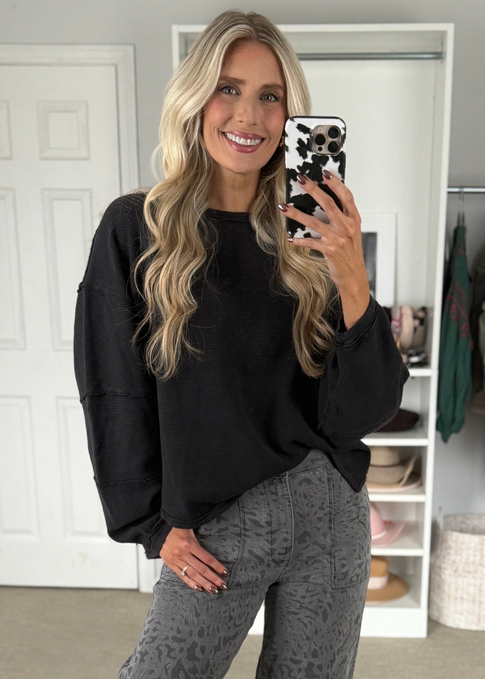 Super versatile, charcoal black pair this oversized top with your fave jeans for a laid back look. Ribbed, with exposed seams, drop shoulders and high/low...