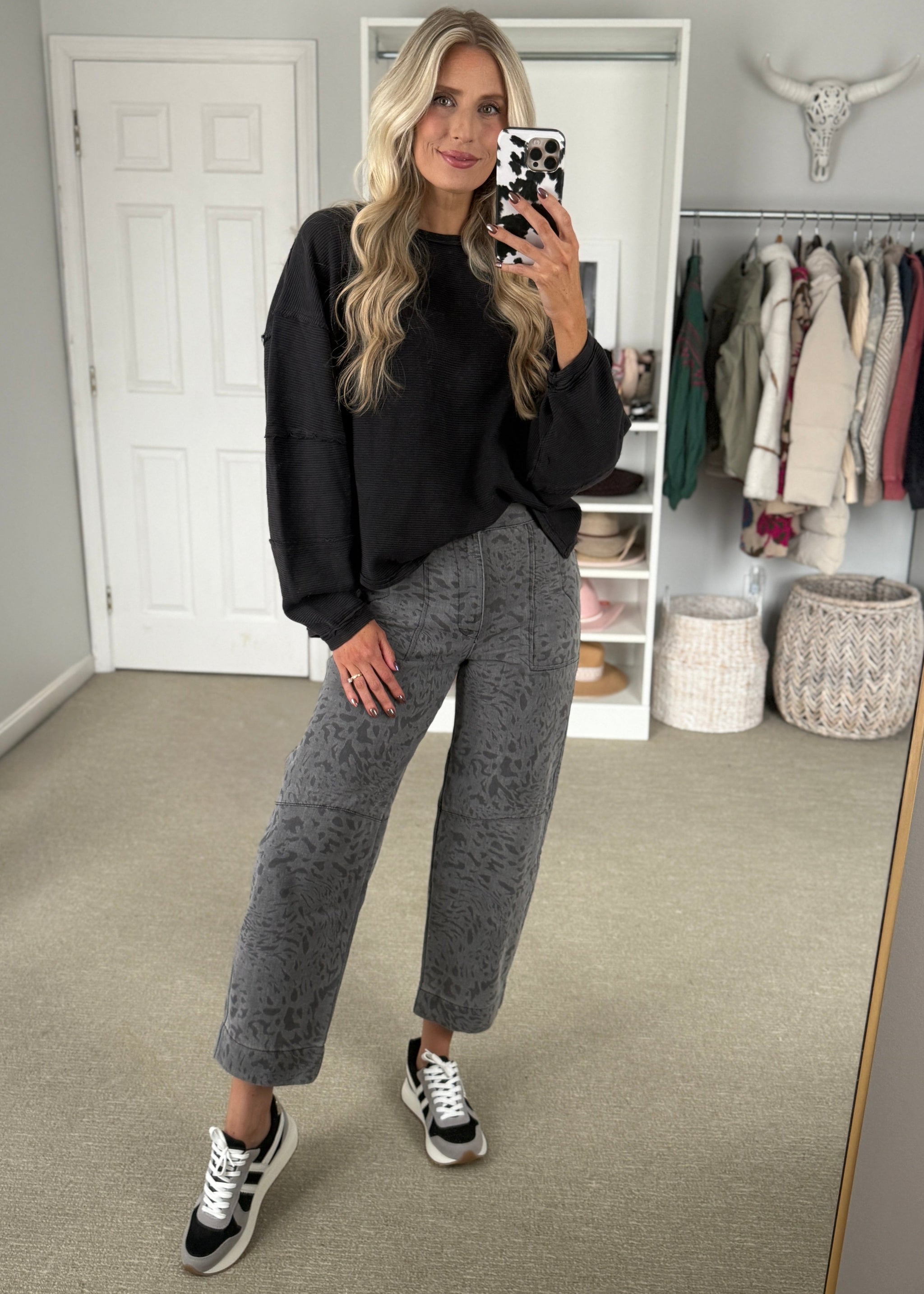 Stand out in style with these modified barrel leg pants, featuring a striking animal print in a cool grey shade. Made from super stretchy material,...
