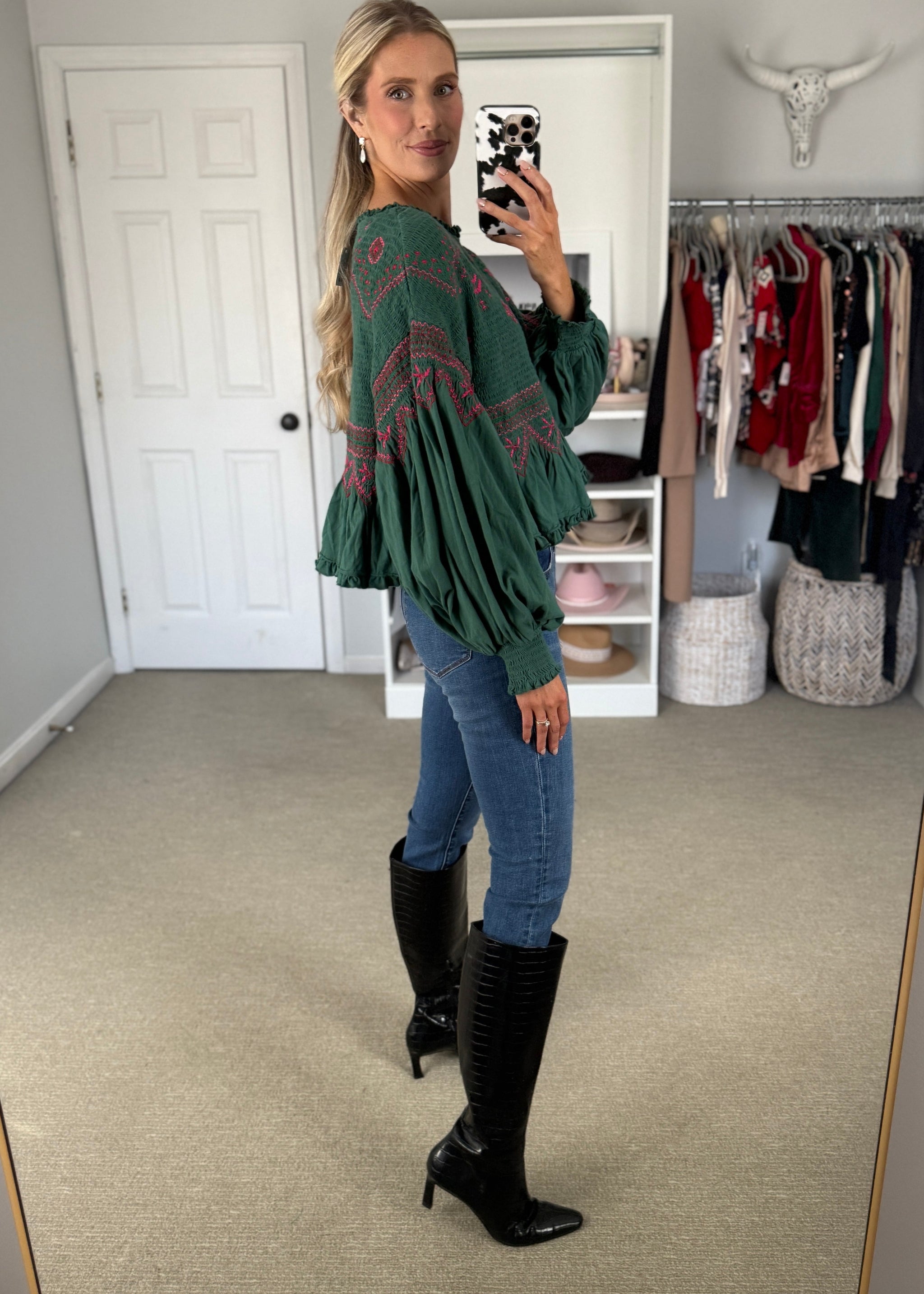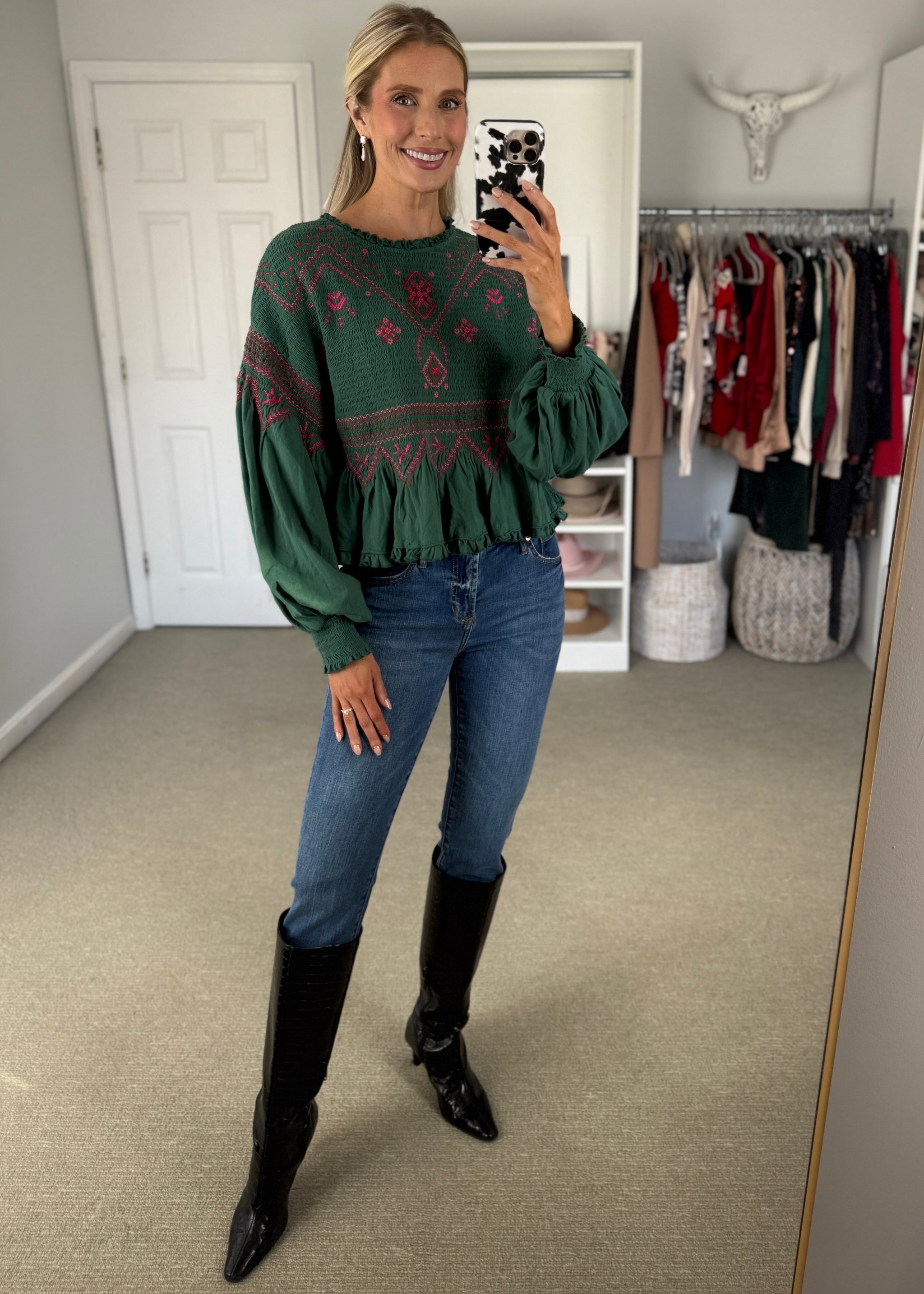 This sage green denim blouse features intricate floral embroidery and delicate cutouts, adding a feminine touch to its relaxed silhouette. The V-neckline and button-down front...