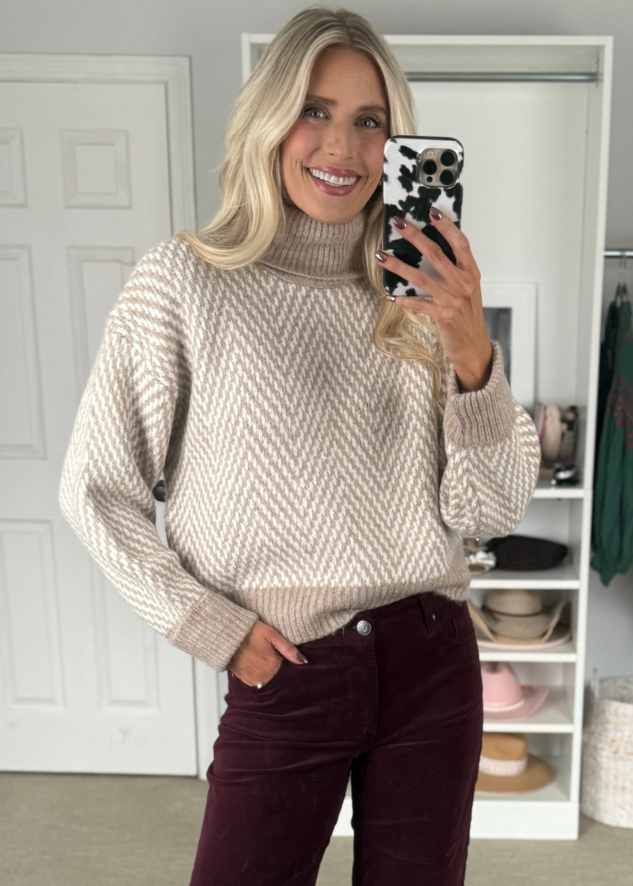 A classic herringbone turtleneck in a taupe and white. It's thick and cozy and you'll love to wear it on cold winter days. nylon/acrylic/poly/wool/spandex.