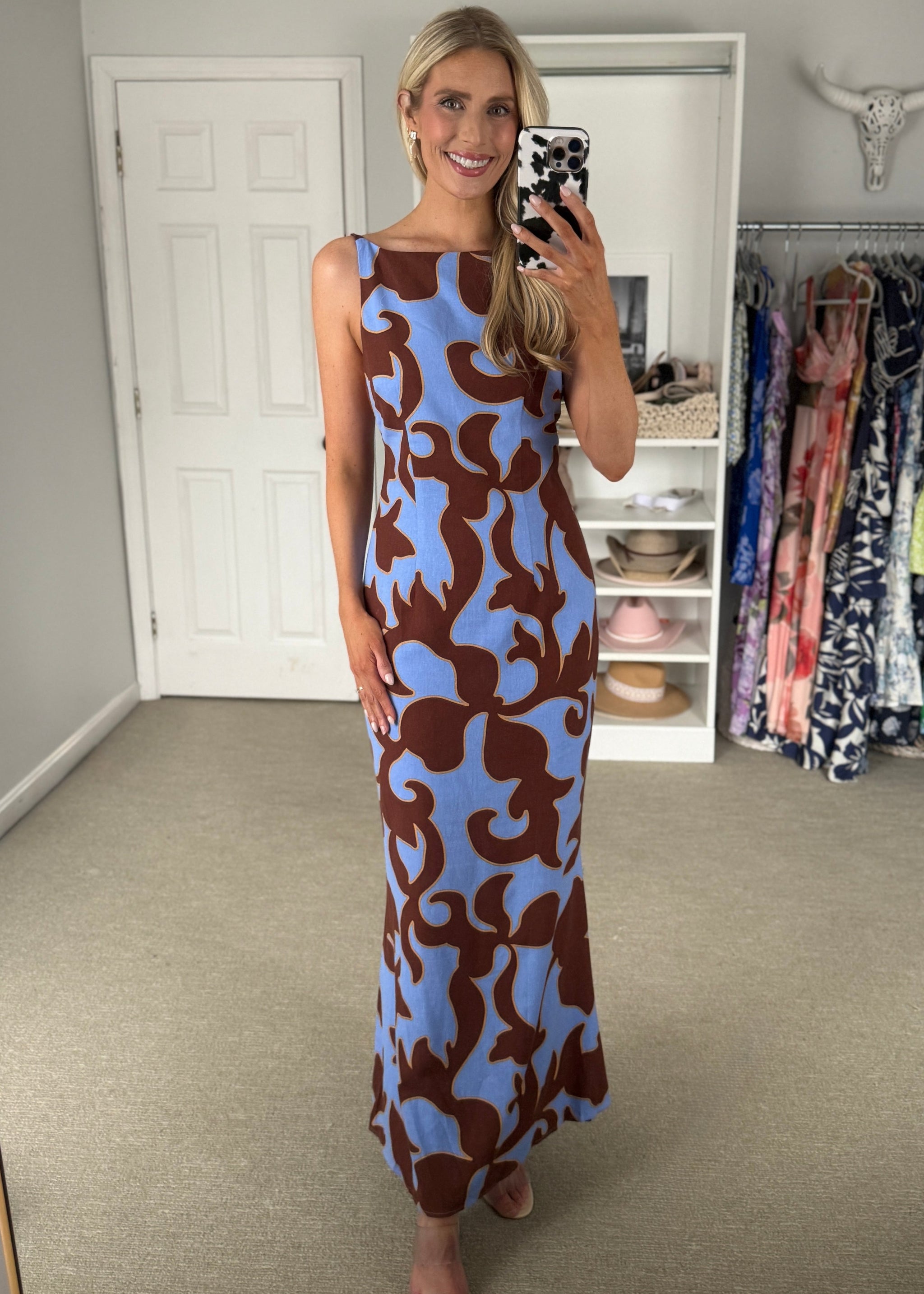 Blue and brown patterned maxi dress in a linen blend. Backless style. True to size.