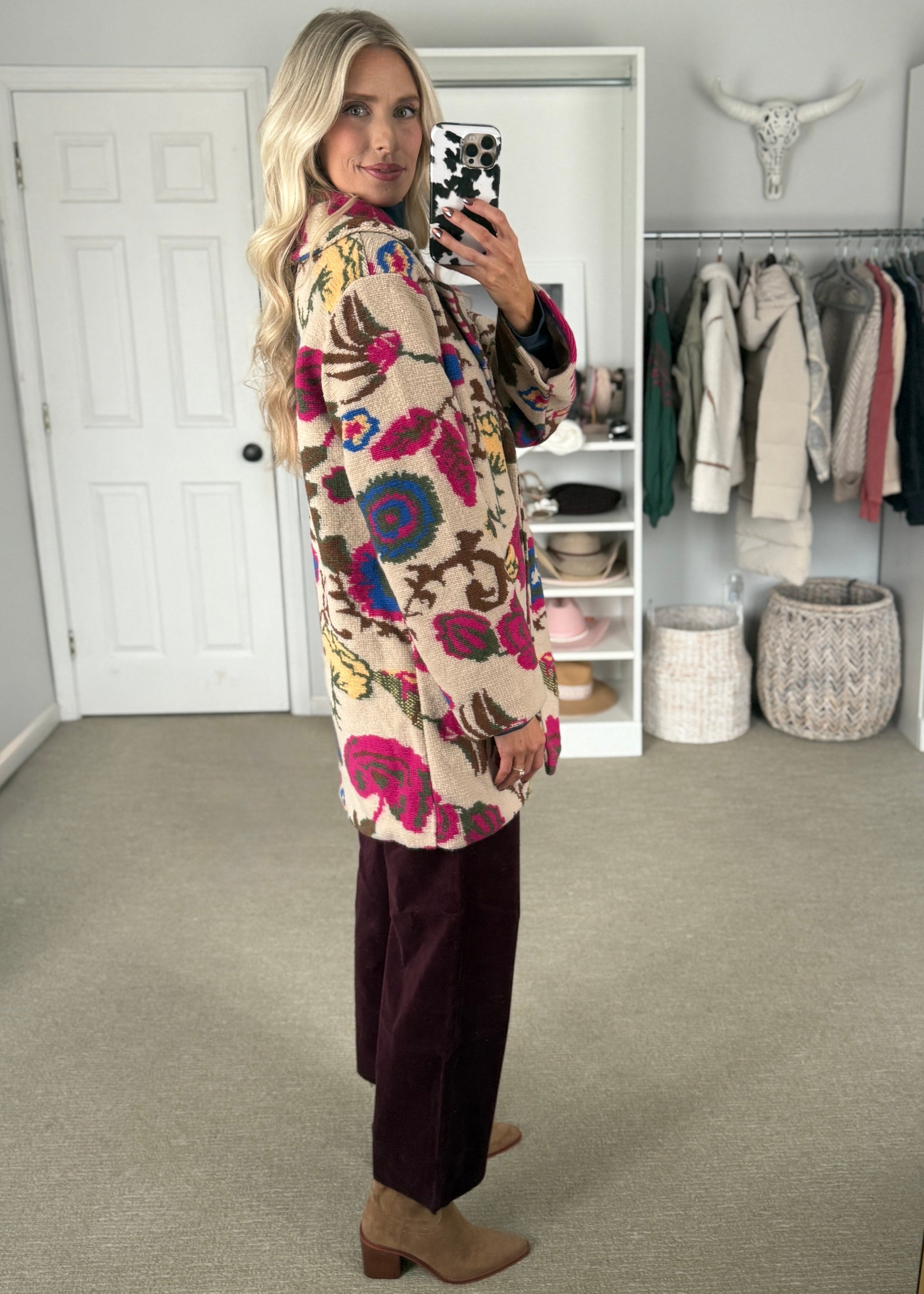 This striking, colorful coat made in a tapestry-like boucle, is so fun! On a background of oatmeal, it includes fuchsia, blue, green, brown and yellow....