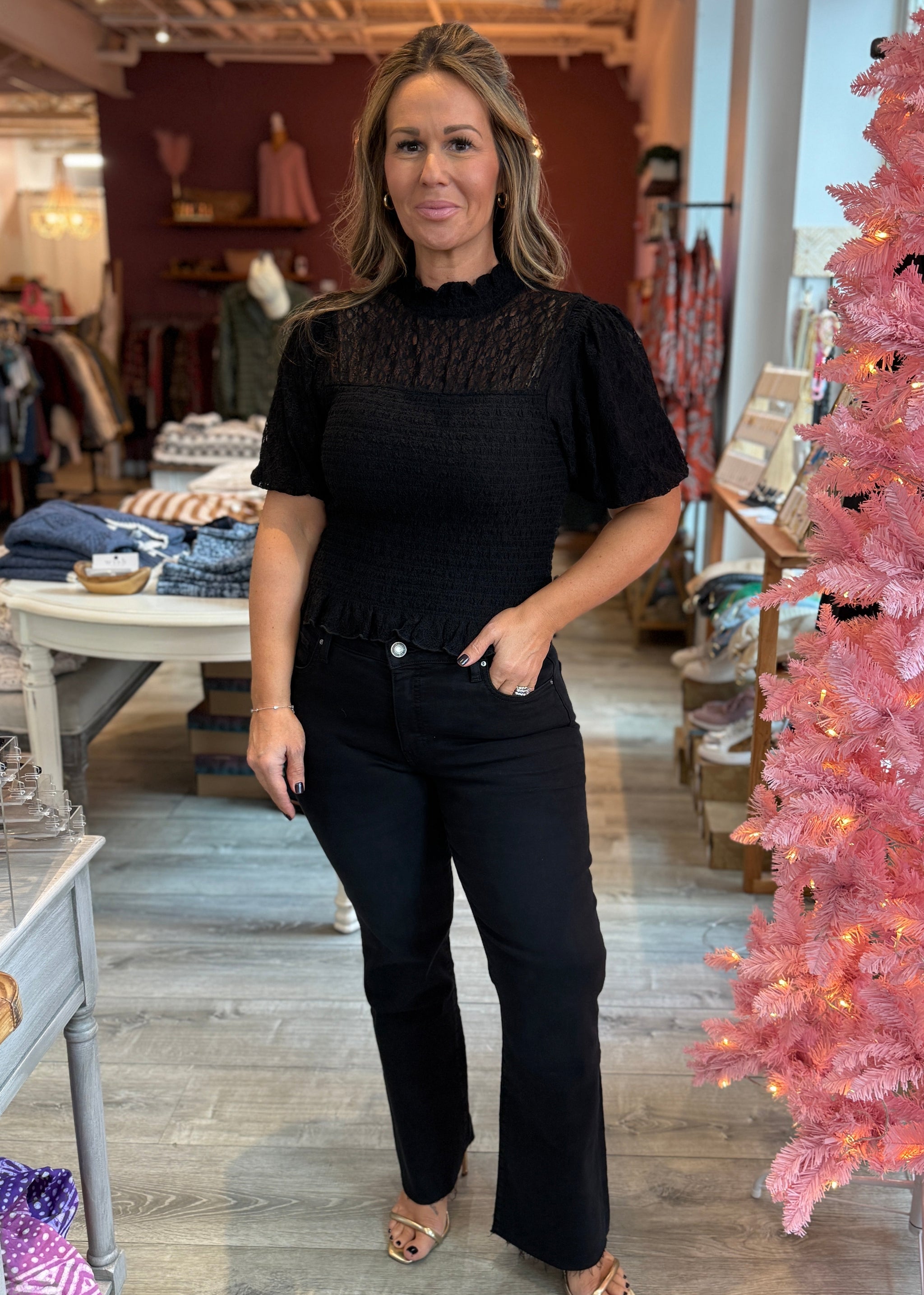 This delicate and feminine lacy top is soft and stretchy for the perfect, comfy fit. The smocked bodice ends in a pretty ruffle and the...