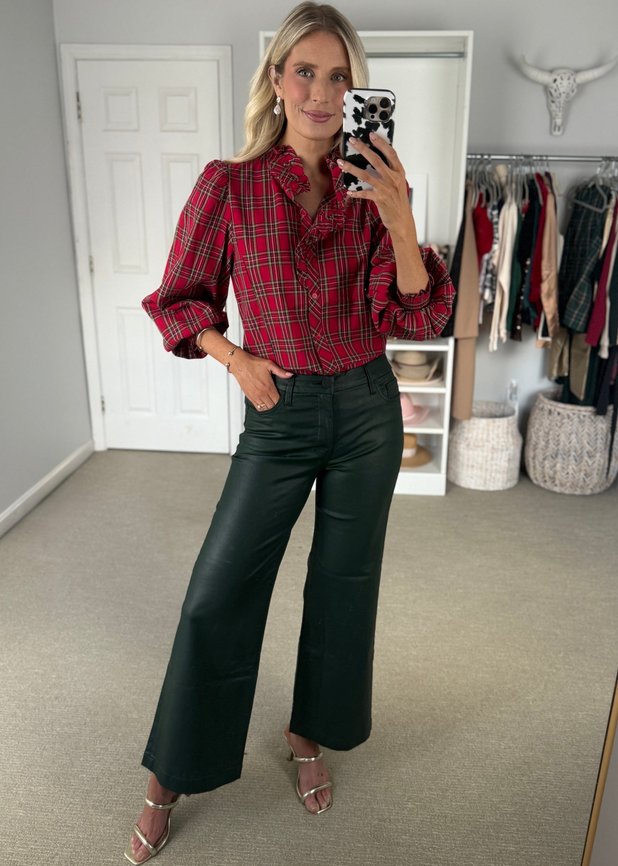 Celebrate the holidays in a traditional plaid done in gorgeous red and black. This festive blouse features a ruffle-accented button-down front and High ruffle neck....