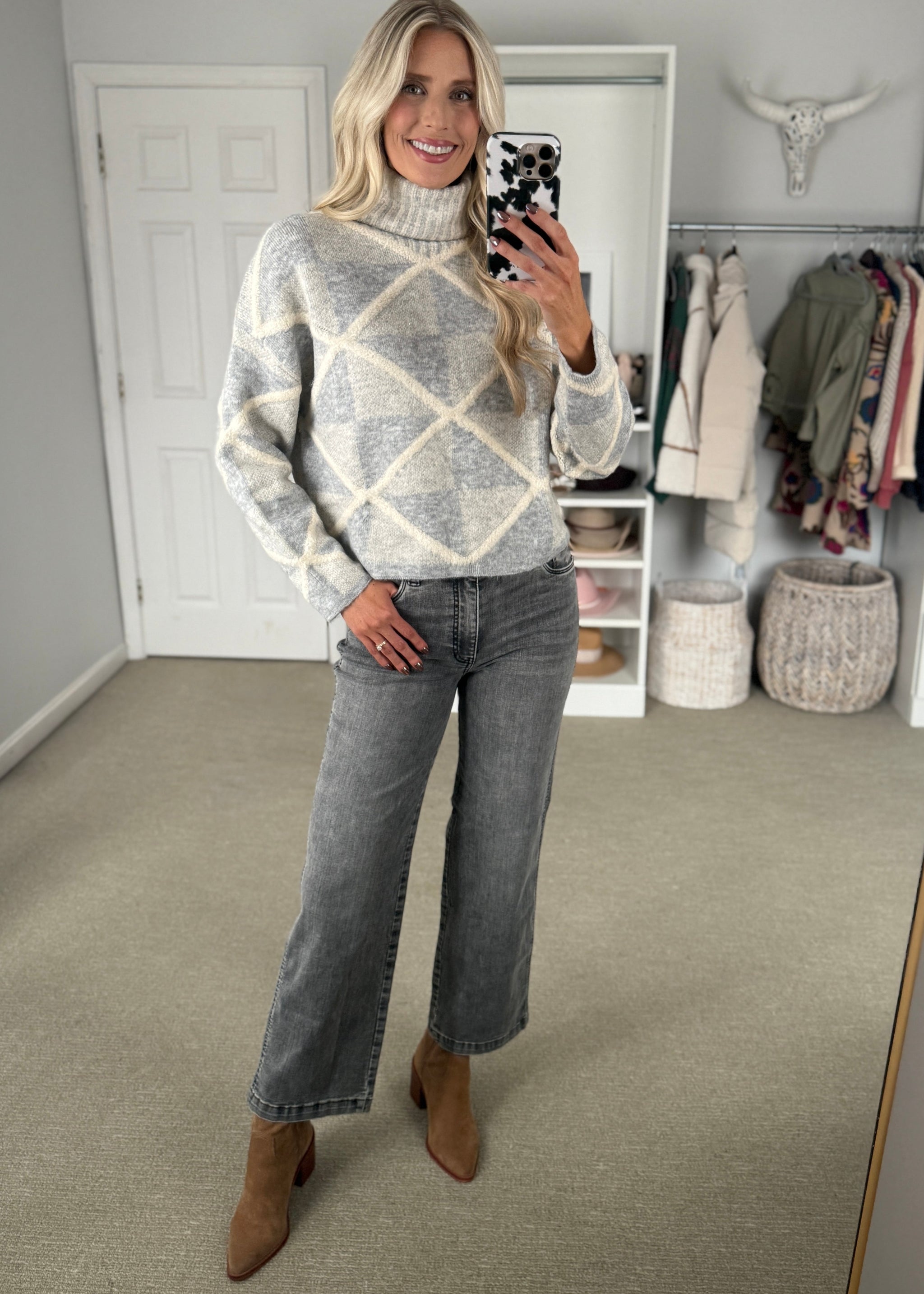 We are loving the neutral, tone-on-tone look of this sweater. Featuring a cozy turtleneck, it is made in lovely shades of taupe, oatmeal and cream....