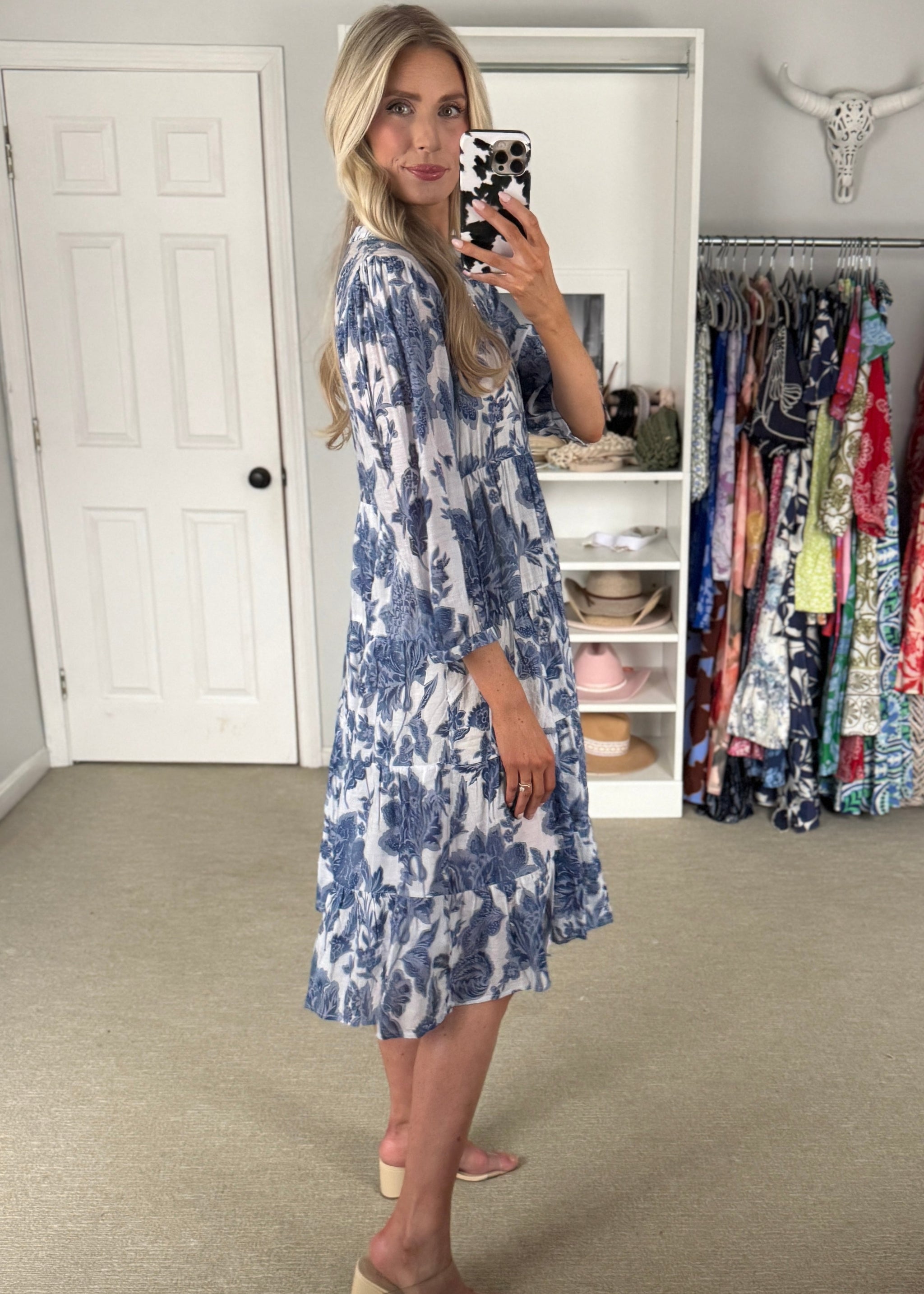 Bright blue on blue floral in this cocktail dress. Bottom portion is fitted with a blousy style top. True to size based on bottom half.