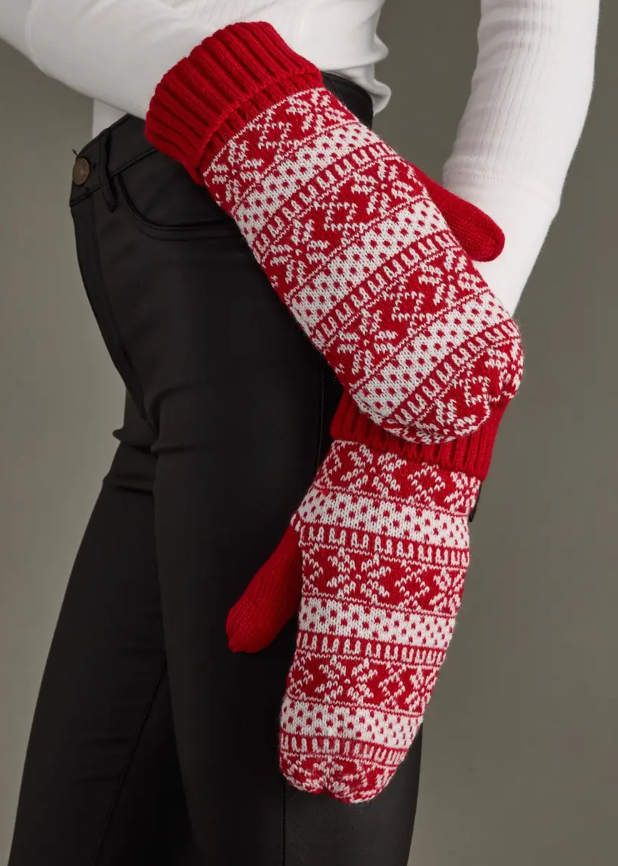 Adorable and warm, these traditional red mittens are fleece lined and cozy. 100% Acrylic. Also available in green.