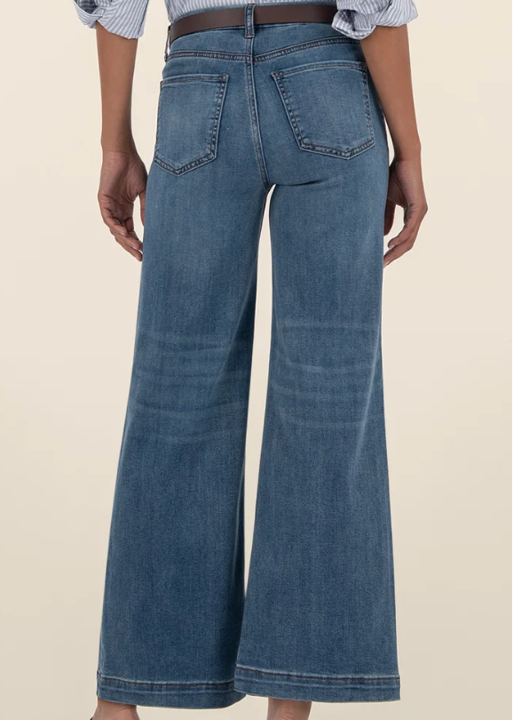 So incredibly soft and stretchy! Featuring a moderate high rise and front patch pockets with a wide leg and a medium faded blue. The wide-stitched...
