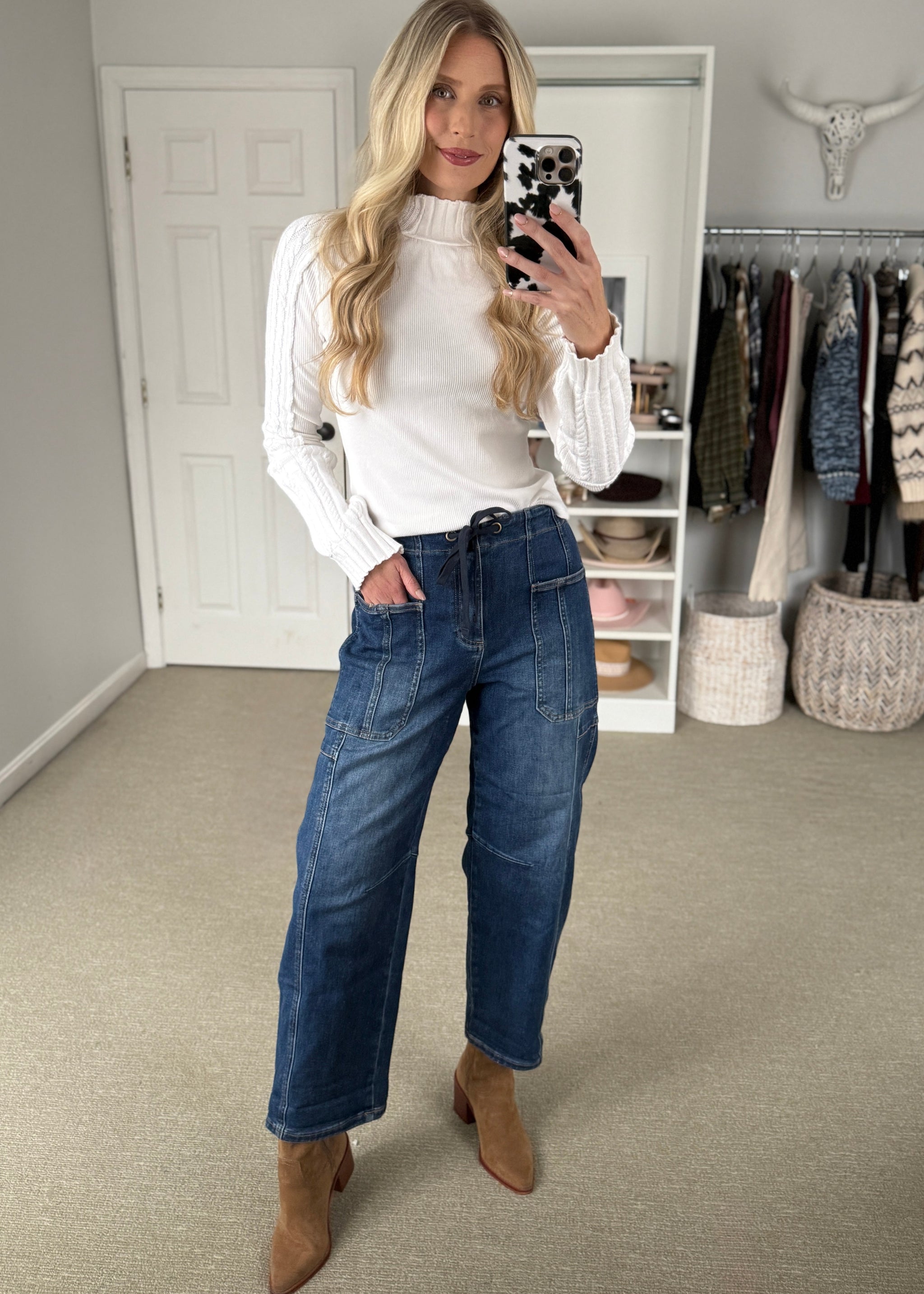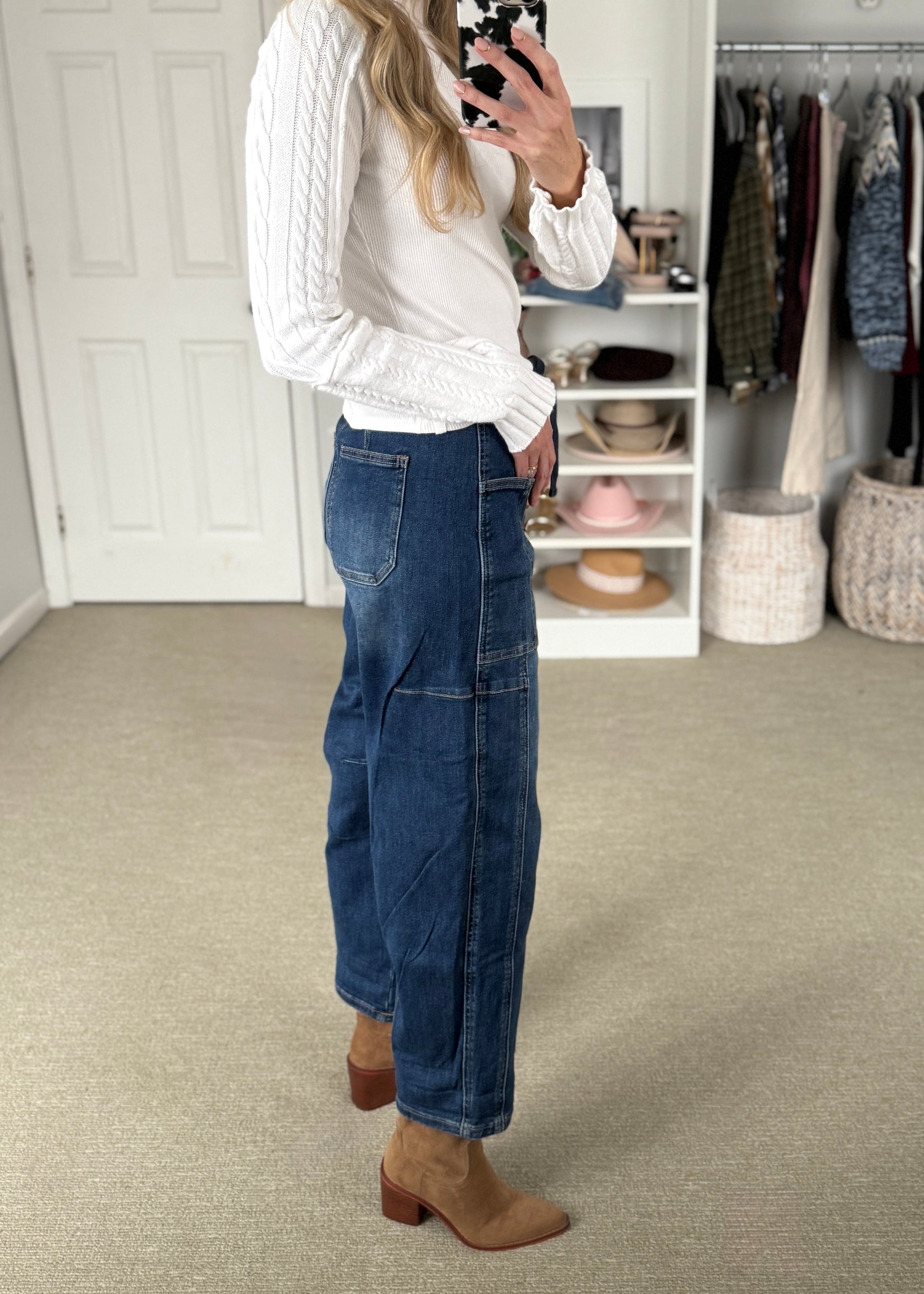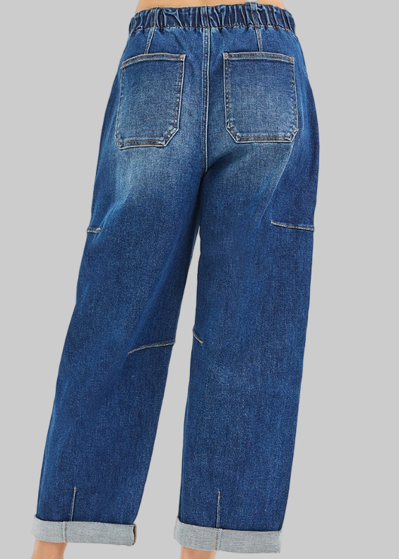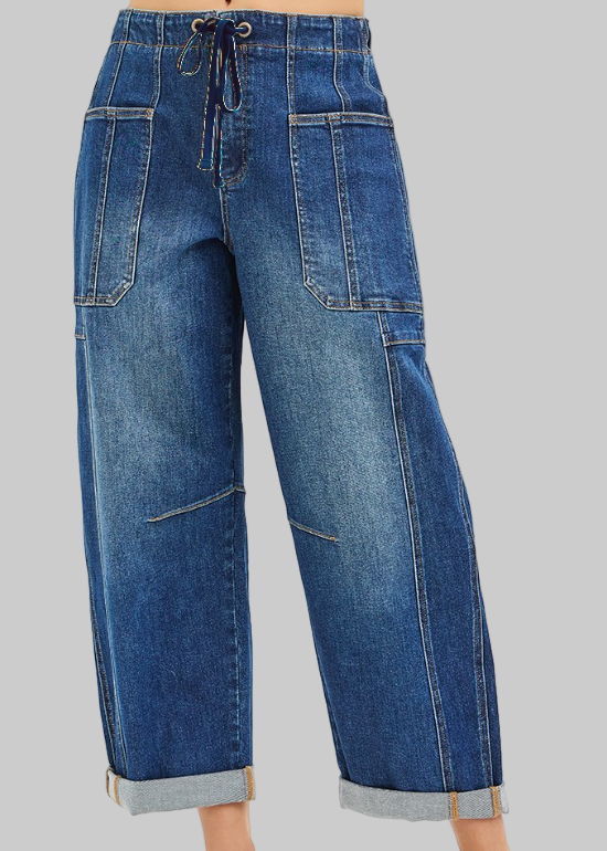 your favorite HIGH RISE CROP WIDE BARREL CARGO POCKET jeans IN a mid to dark denim. Comfort stretch denim with a draw string elastic waist....