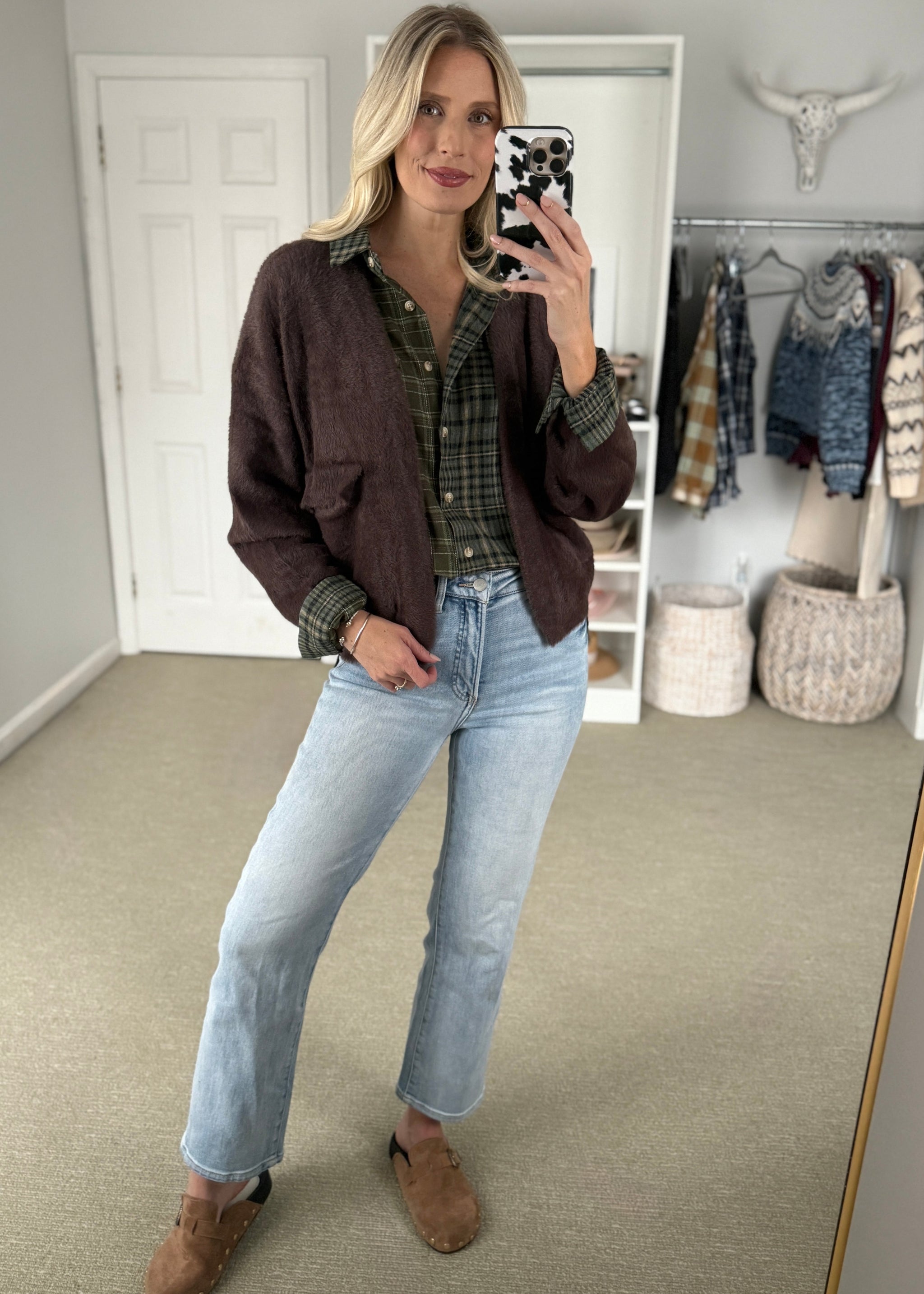 A feminine take on a fall flannel. Balloon sleeves with denim trim at the neckline and mini denim blue ruffles at the cuffs. 55% Rayon,...