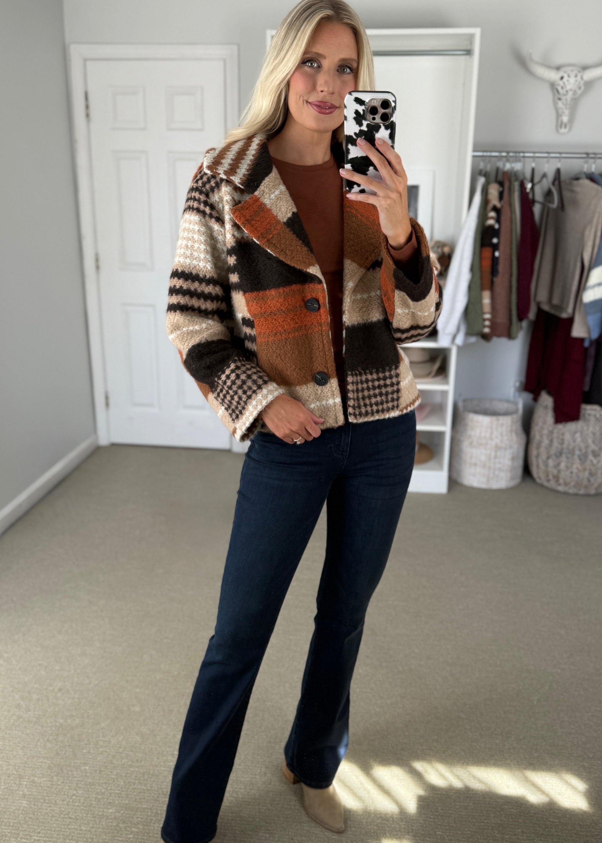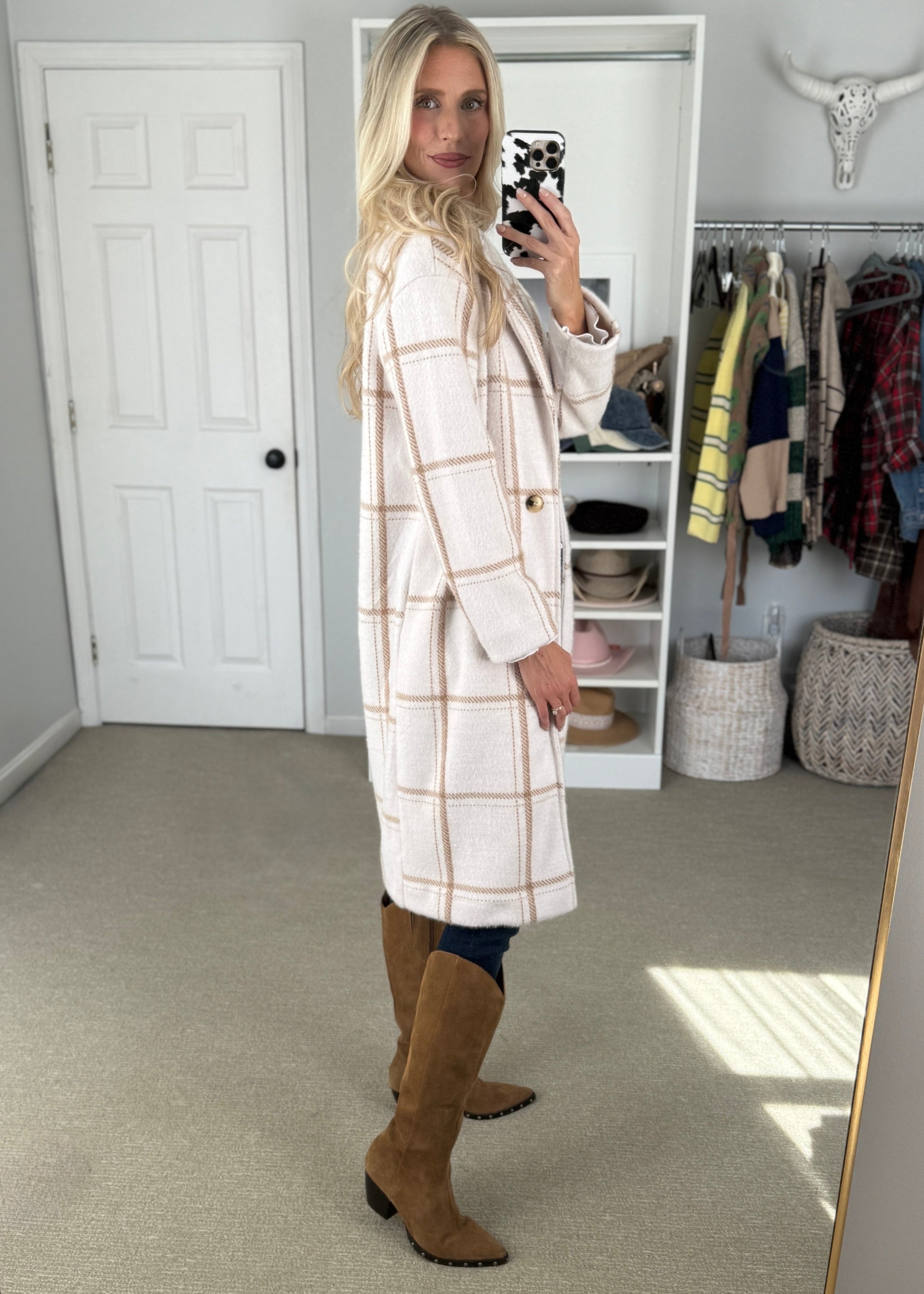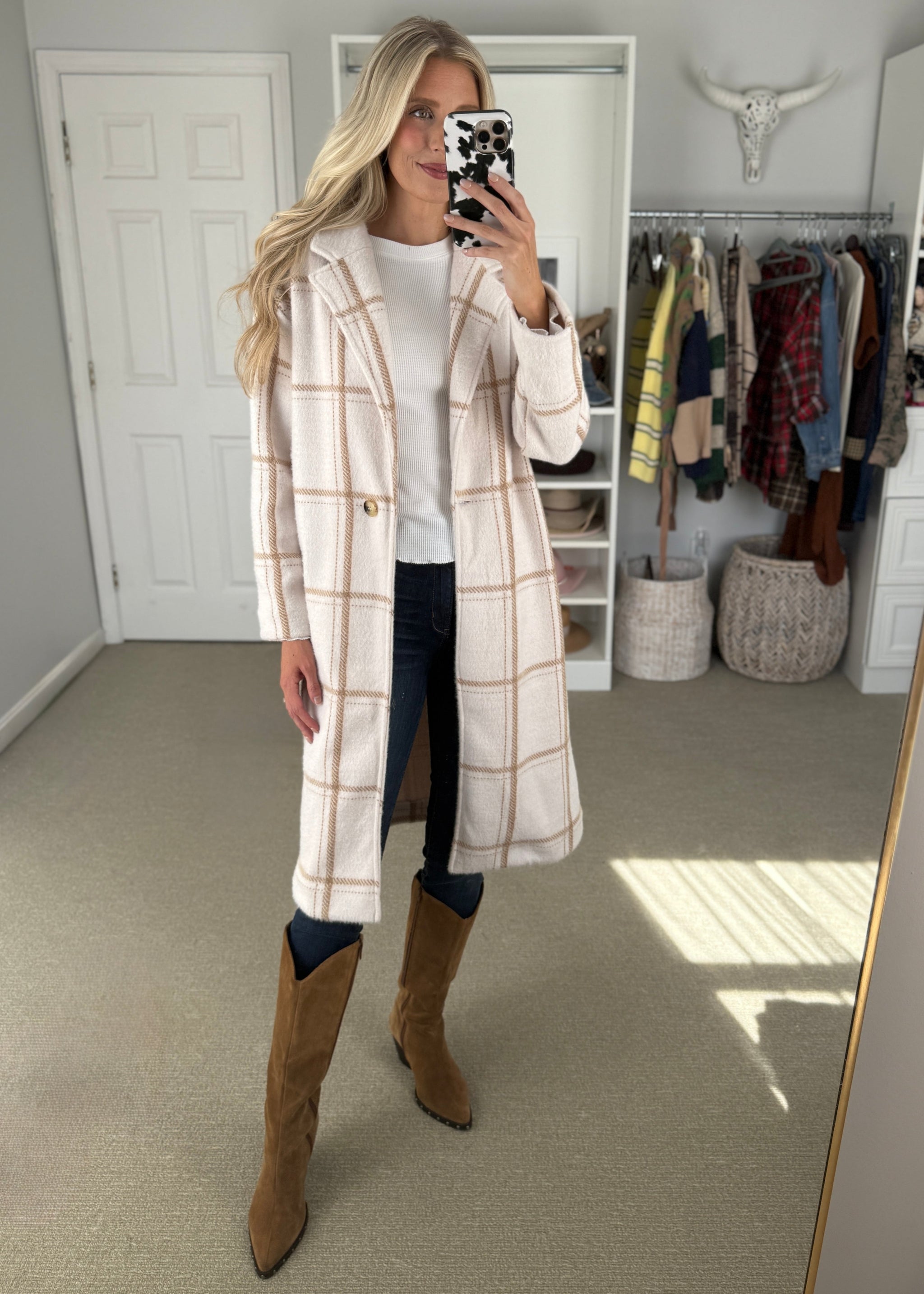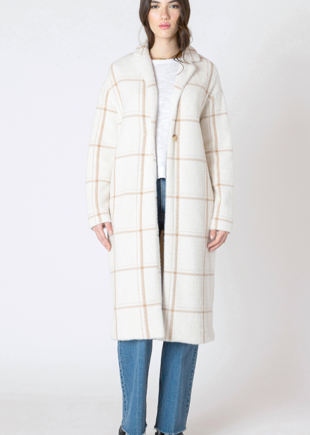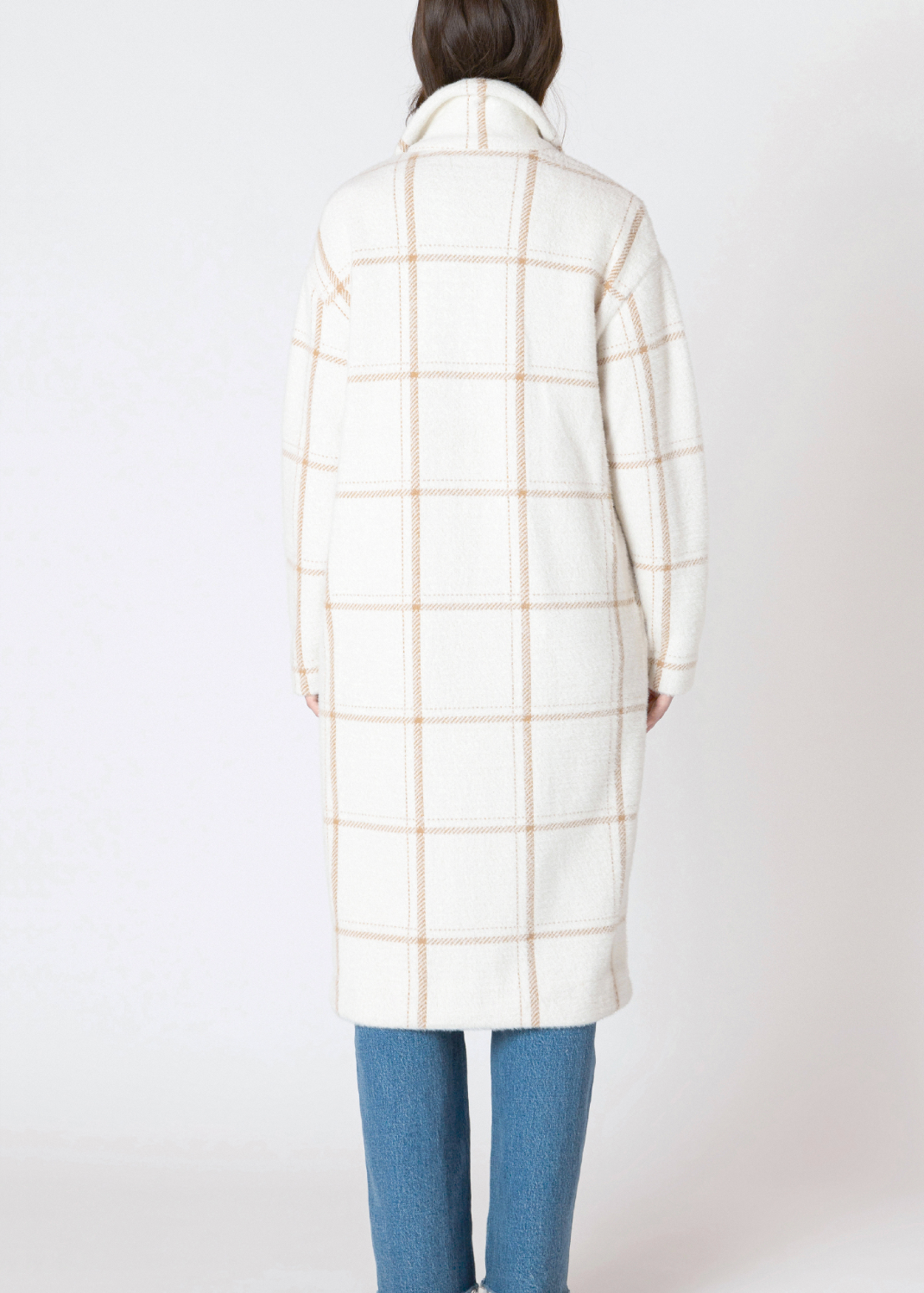 Wrap yourself in this ultra-soft and luxurious brushed polyester coat. Sophisticated cream with a caramel windowpane check, a one button closure and roomy side pockets....
